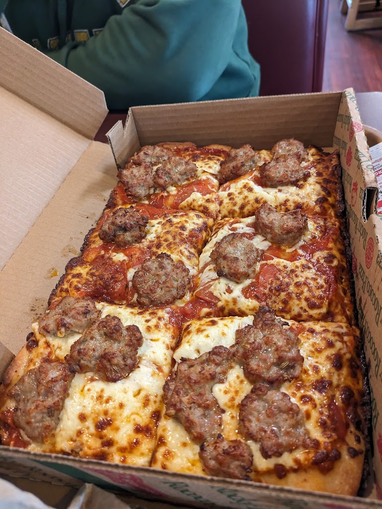Always feel this place is dirty. The atmosphere is dull, but the majority of Rocky Rococos are dull as they are not their own buildings nowadays and just thrown into a strip mall. Food is good when hot . Still my favorite thick crust pizza and great sauce and sausage. On the other hand, they have been really cheap and stingy with their sauce. I asked for extra sauce and got almost none. They said they would fix the issue but it happened again for the second time in 2 weeks. Just cheese and bread that's not a Pizza. You can see from my photo after removing the cheese. I reached out and no response.