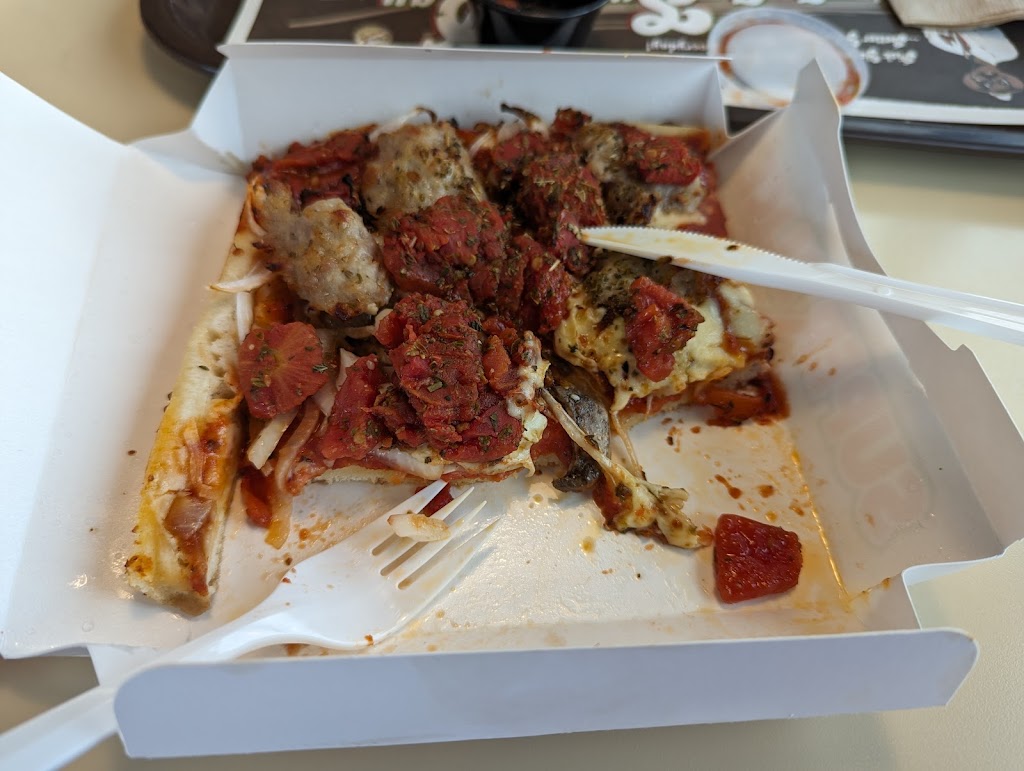 This is a great place to get a sleazy slice. I don't know how else to describe it but if you want something just kind of wet, fast, and a bit greasy this is the place lol. It is very quick, but honestly compared to other quick pizza places this is among comparable. I don't think it's overall bad, I just don't think it's great in the slightest. To put it short, it is okay, and I don't think it needs to be anything more for what it sells.