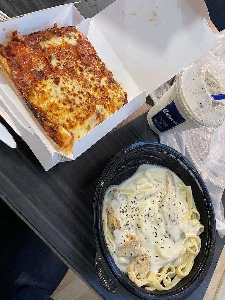 I love there pasta compared to dominos past it was horrible there were burnt chicken and pasta in it but rocky rococo's pasta is really good and It last for 2 meals!!!