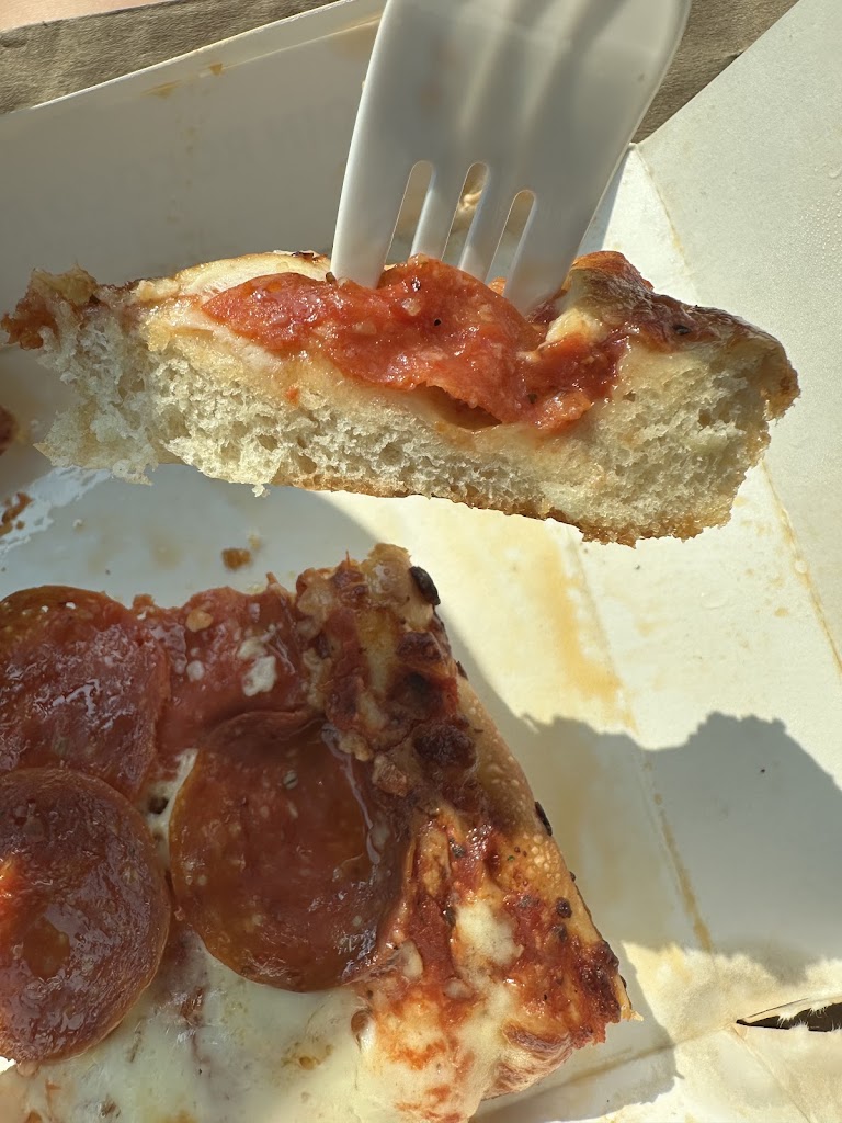 I ordered a slice of the Superoni (super pepperoni) pan pizza and a chicken Alfredo pasta. The pizza dough was super soft but not overly airy or dry in any way. The slice was loaded with sauce, cheese and pepperoni. I actually ate half of it with a fork and knife like a sicko, after the cheese cooled I ate it with my hands like a human.