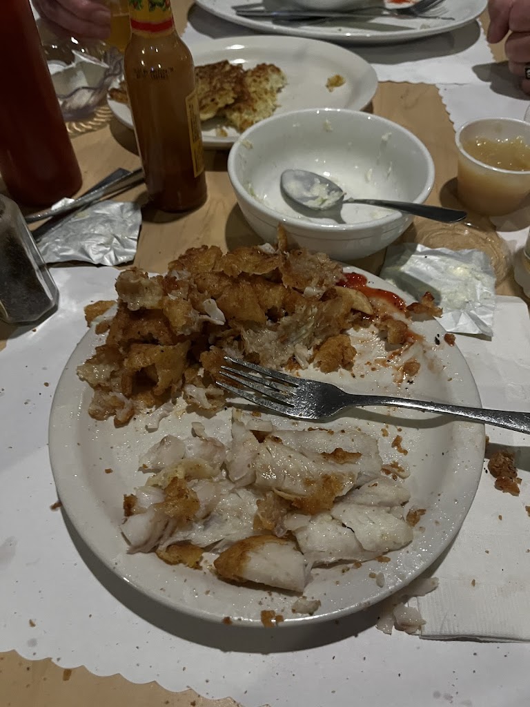 Potato pancakes are decent, but the tiny amount of fish you get isn’t. Next time you get fish from there, take the breading off and see how much fish there actually is. This pic was a DOUBLE order and 4-5oz of actual fish at best. Sorry, not paying for grease and batter.