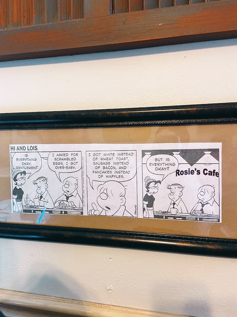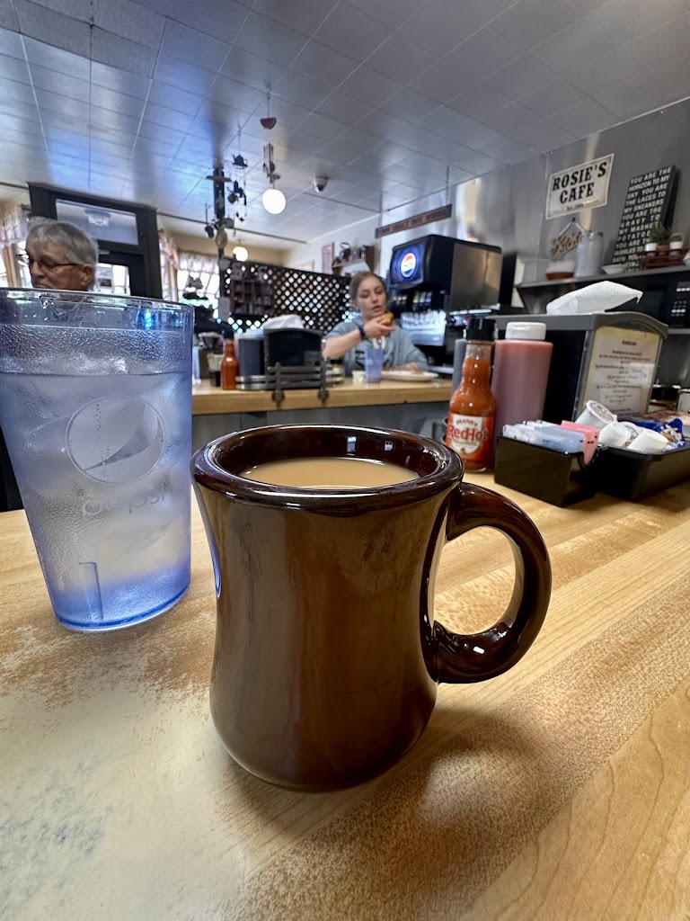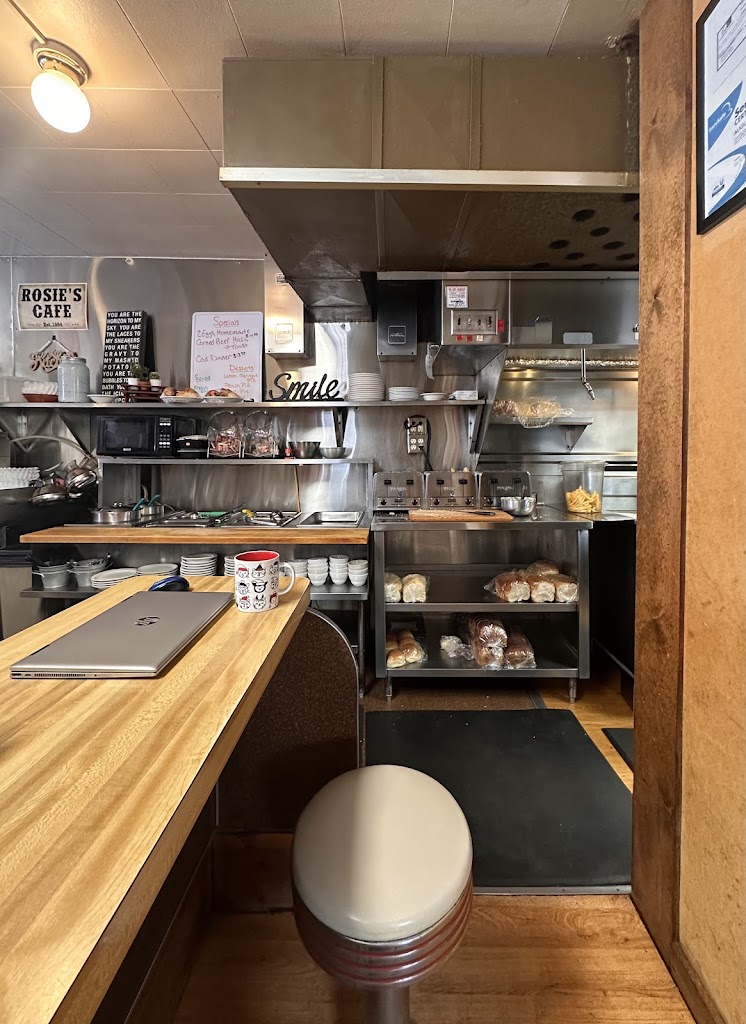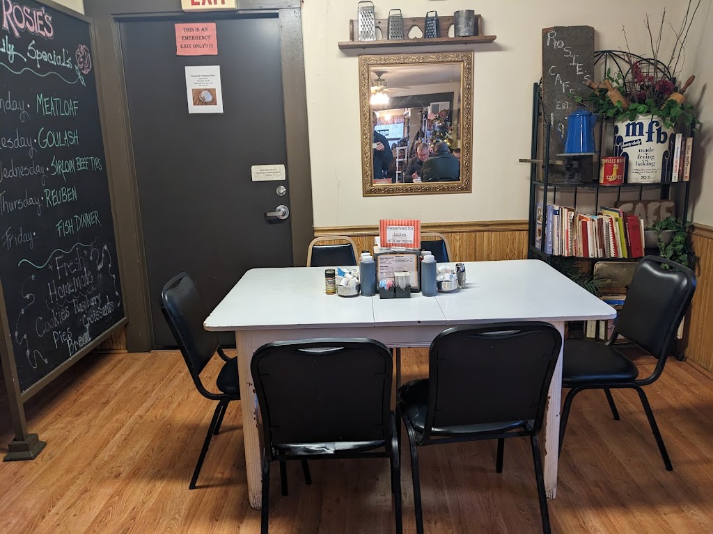 Rosie’s place is small, but very quaint. A classic diner serving breakfast and lunch. Customers can sit at the counter next to the open kitchen or find a booth in front or table in the back. Our server was great and came back multiple times to check in and make sure we had everything. Let’s just say our cups were never empty. The food was delicious and filling and decently priced. The place reminded me of the memories I spent eating at truck stops with my grandparents. Coffee always hot and eggs made any way you want. I look forward to going back!