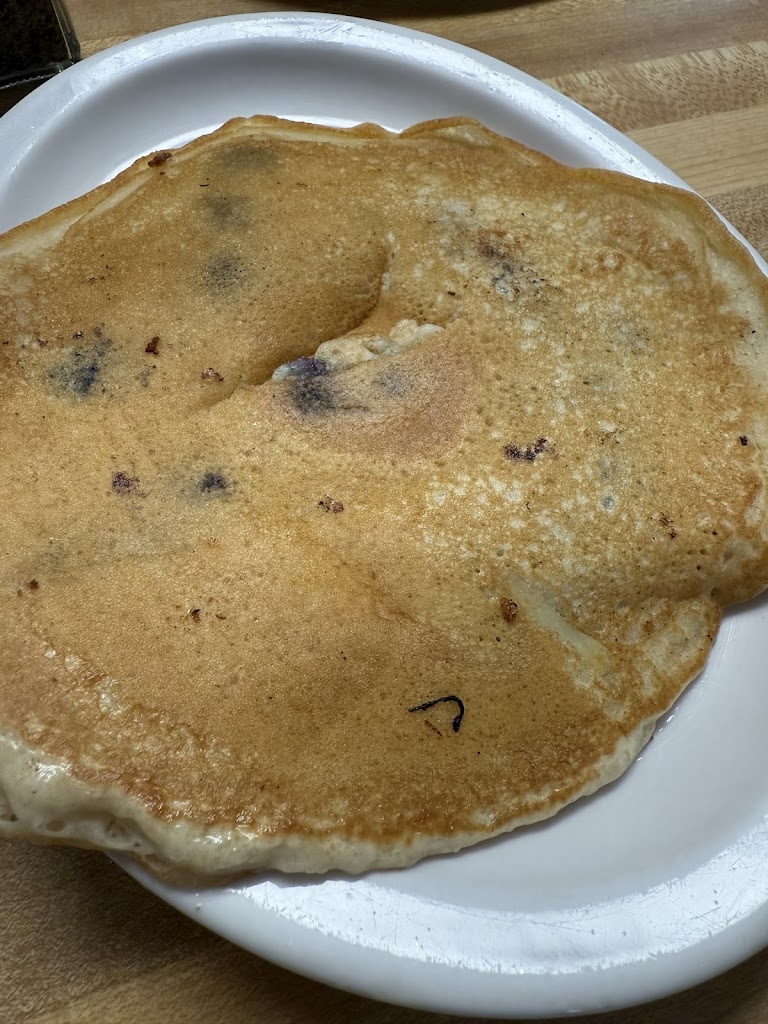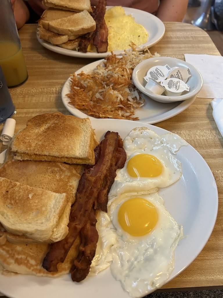 Huge, fluffy pancakes that aren't overly-sweet, my toddler actually ate the scrambled eggs and she never eats those elsewhere, and the bacon was wonderfully crispy!