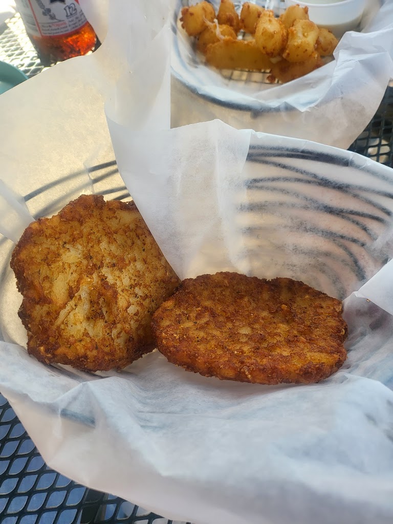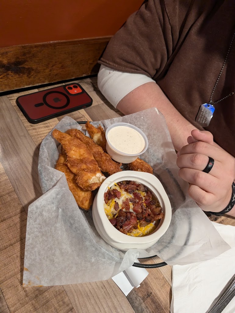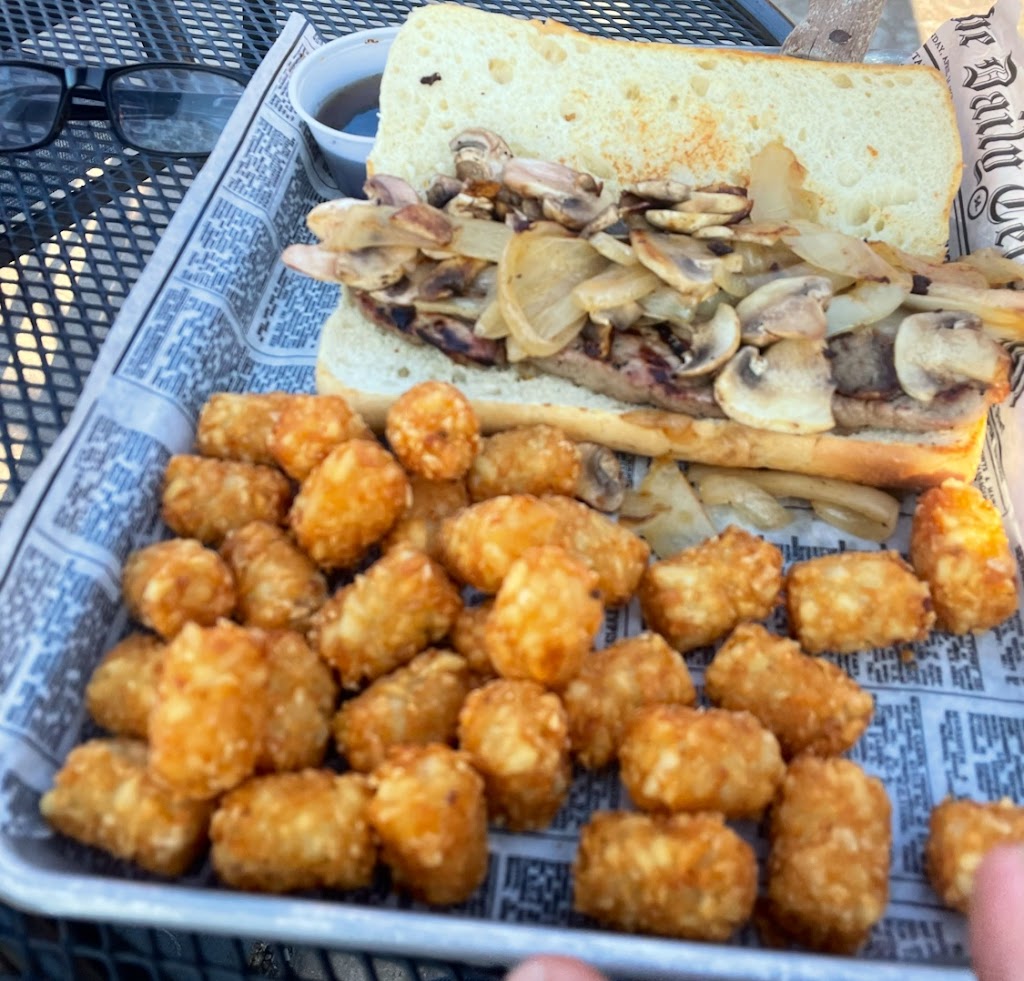 The food was excellent. Had chicken smothered with tater tots. Wife had a gourmet salad. Everything was cooked right.