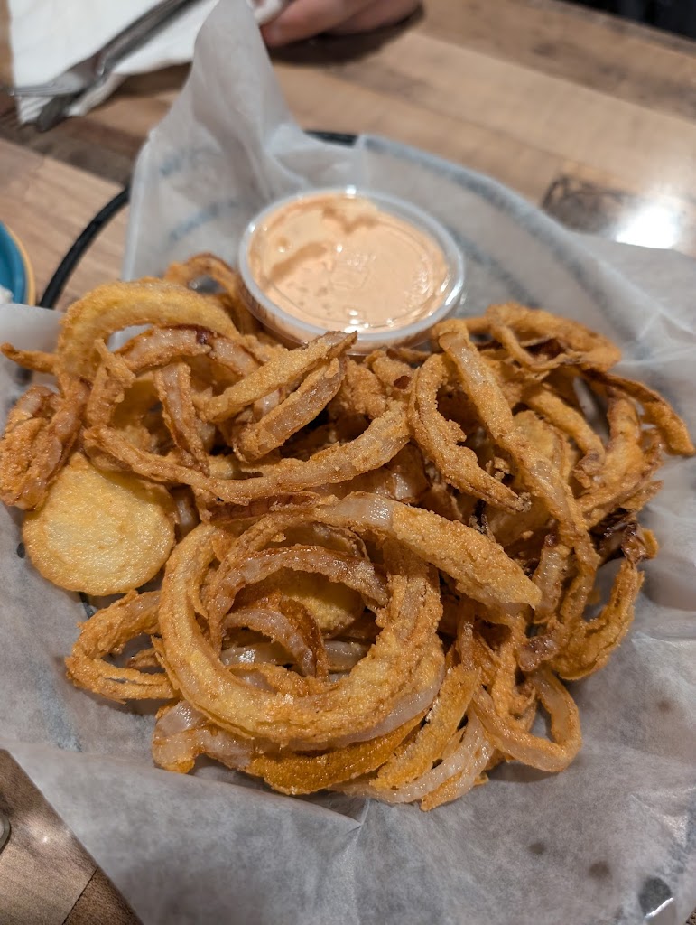 Atmosphere was awesome!!! Onion rings were amazing. Service was beyond horrible. After being seated by the hostess and given a menu, I waited almost 30 min before asking if someone would get me a drink and take my order. Ordered the ribeye. Ive hauled better looking/tasting beef to Hormel!!!! I might come back but itd only be for the live music. Yes...there was a band. Yes...it was moderately busy. But NOT that busy.