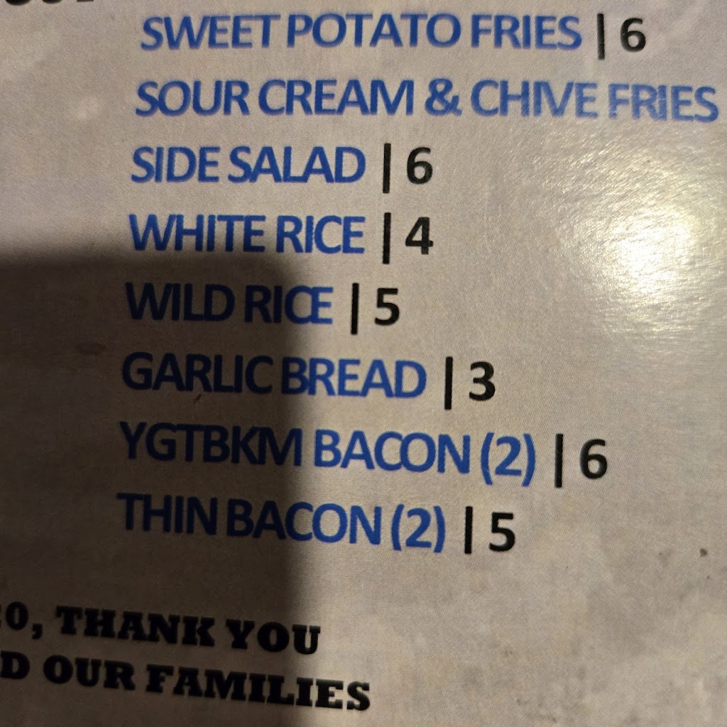 Called to order ribs and chicken tenders. Was disappointed that the cost was not what was on the menu on their website. The price of the half rack of ribs went up $5 and the tenders went up $3. A $5 increase for some that was $20 is outrageous. They have lost our business.