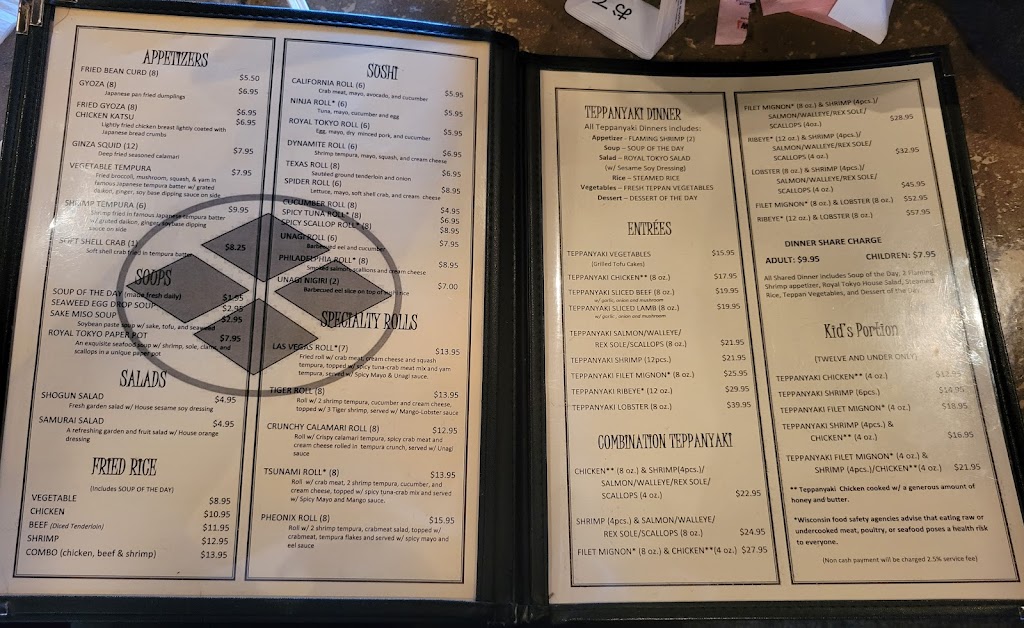 I went to Royal Tokoyo tonight and was not impressed. The waitress spilled an entire glass of water over me, and I was completely soaked. I sat there for 2 hours through the entire meal wet and embarrassed. When it came to the bill, they charged me full price. So rightfully, I asked for an adjustment and only took OFF 3$ for my soda. NOT HAPPY!!!