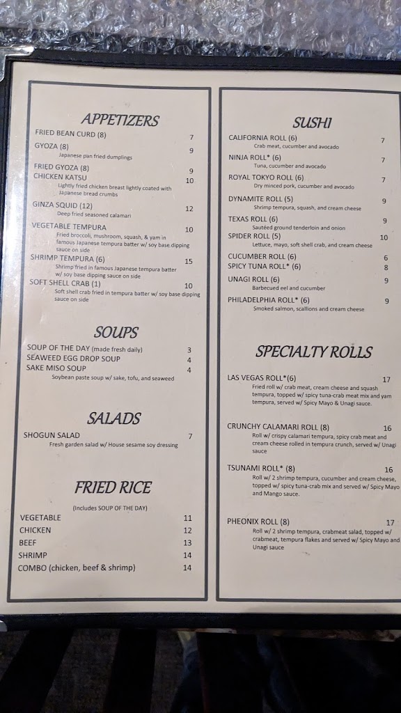 The prices they have posted online do not match what they have on their menus. We ordered carry out sushi under the impression it would be under $30 for four rolls, and they gave me a bill charging 8 to $10 a roll after tax, instead of $5/roll as shown on Google, and they have no dedicated website with a menu. Food is pretty good, but it gets very loud and noisy when they sing birthday songs, and in such a small room it really hurts my ears