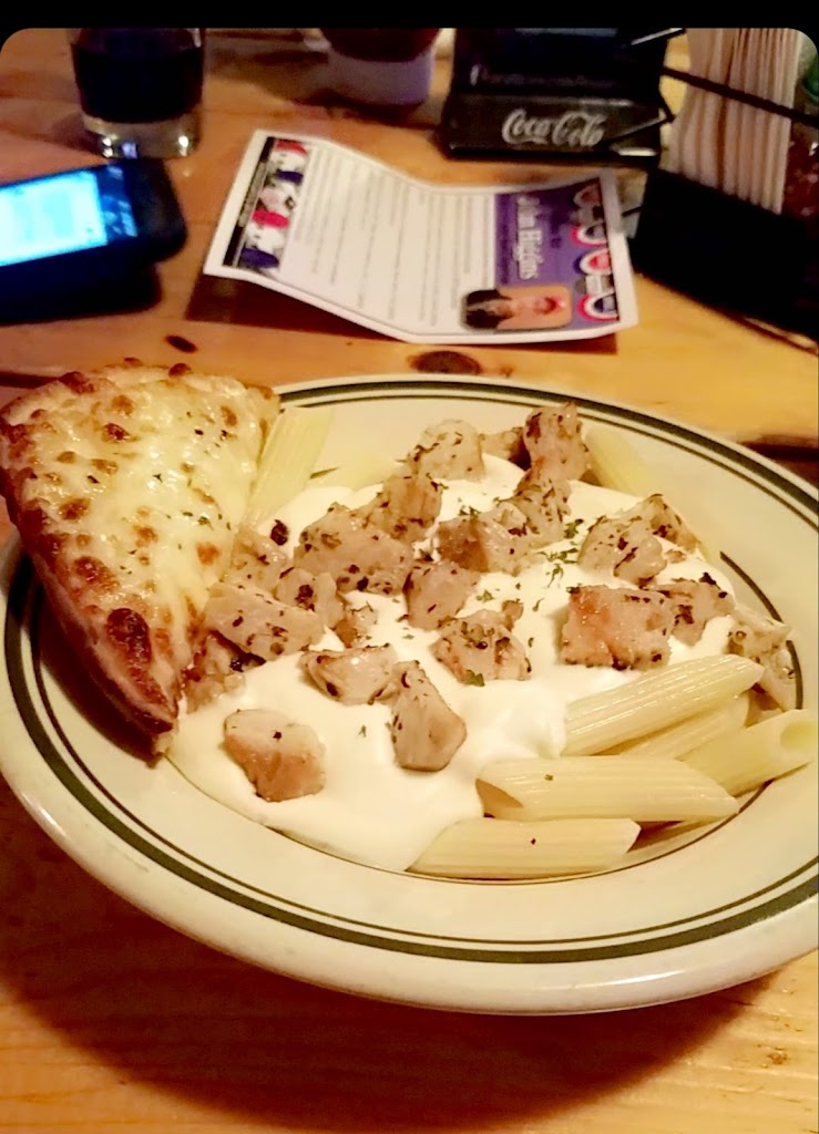 Stopped here for dinner on a road trip. Pizza was awesome and the owner was super friendly. The men in our group raved about the alfredo pizza. Outdoor patio was a great place to relax and eat. Highly recommend!