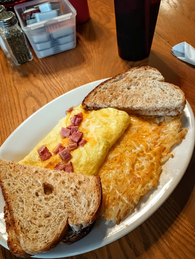Locals are so glad to have a cafe back in town! I ordered a Ham & Cheese Omelet with a side of Hash Browns with cheese on top. Food came out quickly, was good and the service was FRIENDLY!! Good luck Ruby Glass Cafe! 😁