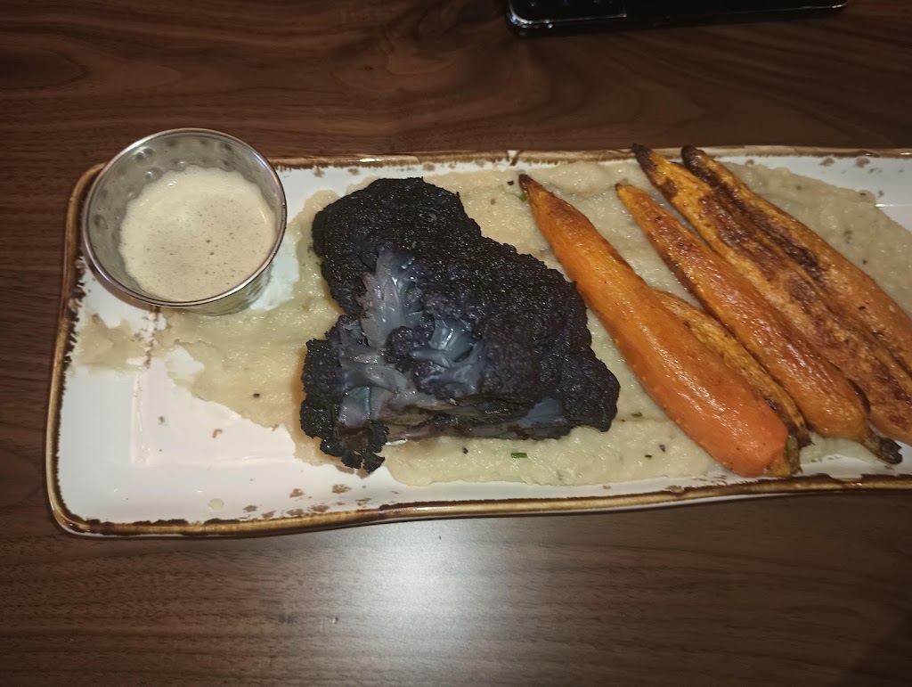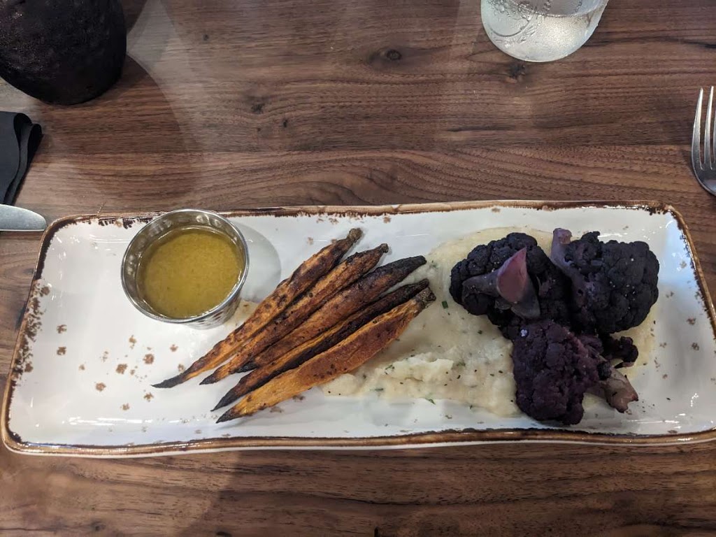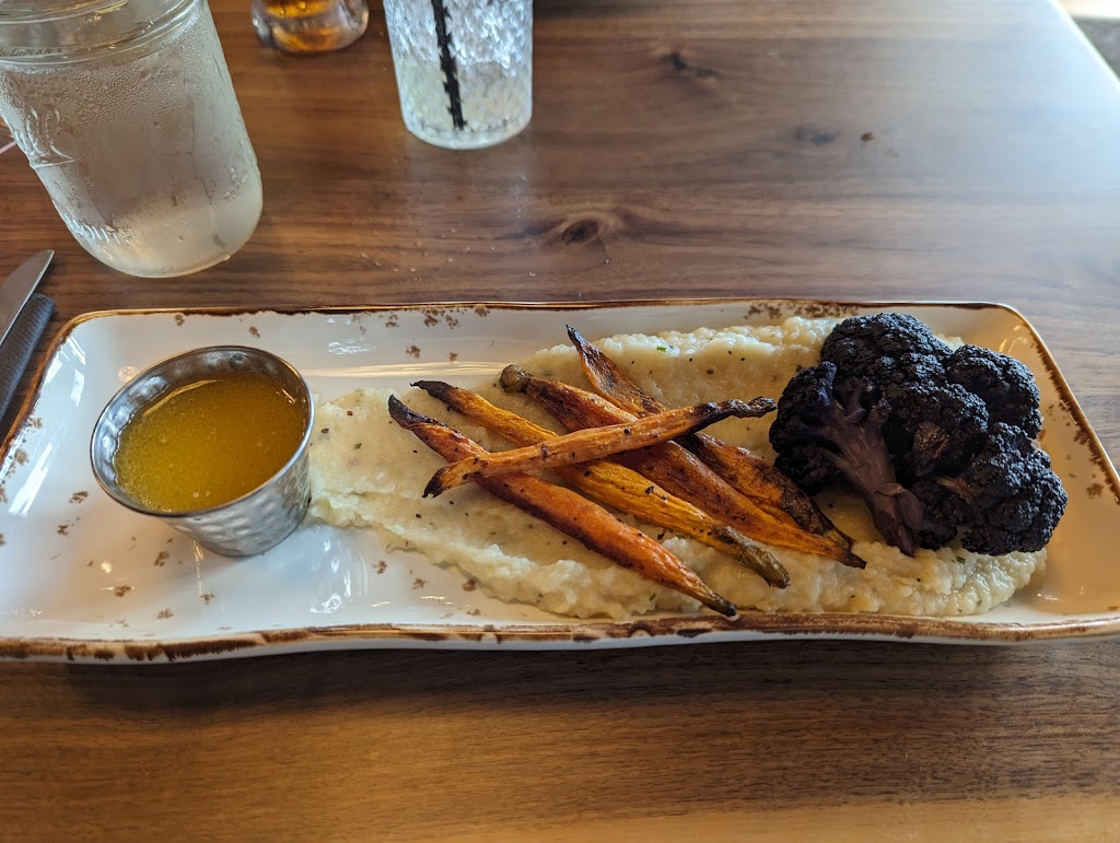 The second of my party of three ordered the cauliflower steak. Instead of a steak style slice, she received three pieces of steamed purple cauliflower. There were also the same issues with their mashed potatoes and carrots. The sauce that was included appeared to be melted margarine with no additional flavor or seasonings.