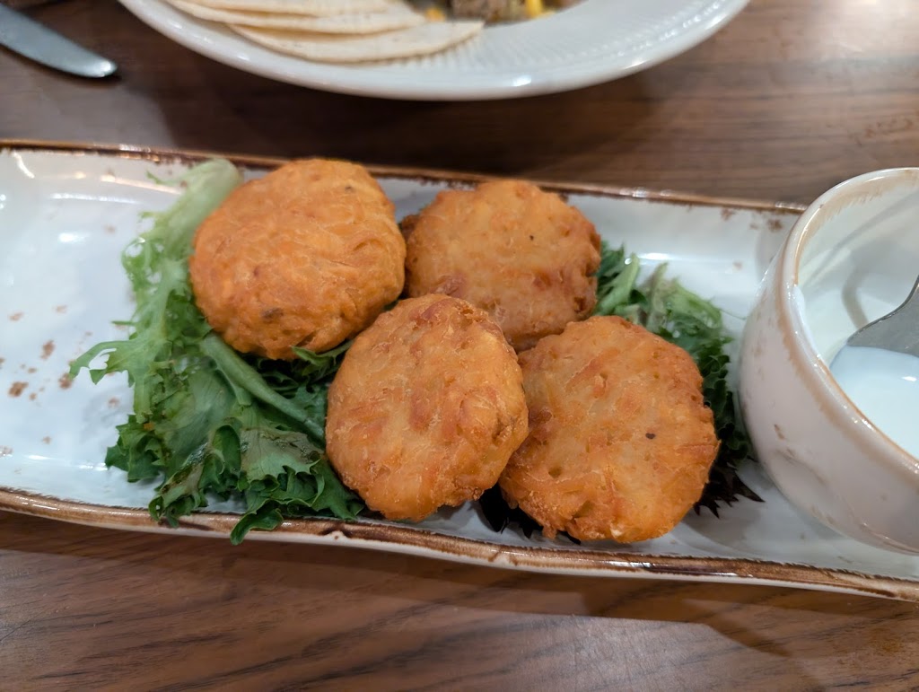We started with the Jala-berry, which were sort of like croquettes made of cream cheese, jalapeños, and cranberries. The jalapeños were very mild, and while I do like some spice, everything came together beautifully.