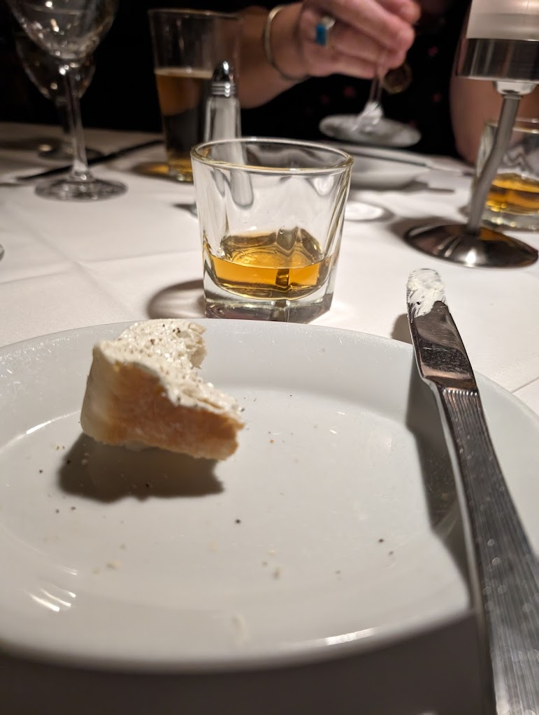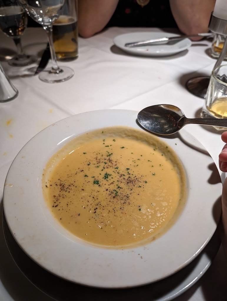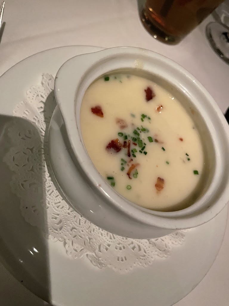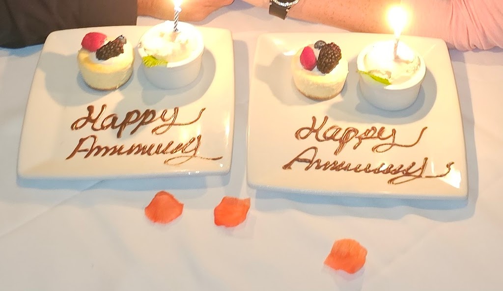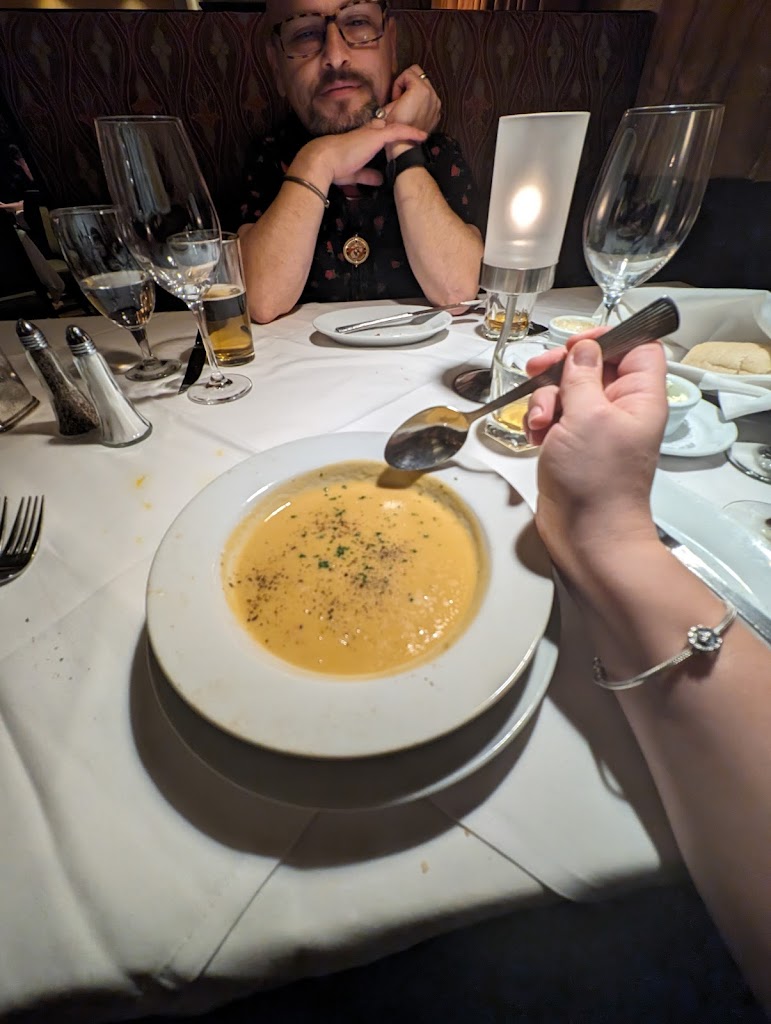 Celebrated our anniversary, RC made it extra special. Extra table decorations, dessert, made sure we got a picture. Started with lobster bisque and a wedge salad, shared the porterhouse, added on hashbrowns and mushrooms.