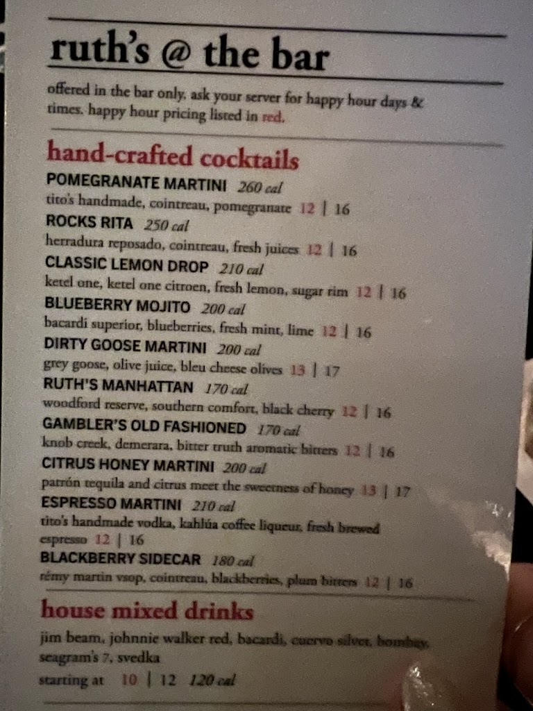 Ruth Chris in Middleton, WI. Great food, drinks and service. They also have a nice happy hour from 5-7pm, even though their website says 4pm. We got the following for happy hour :