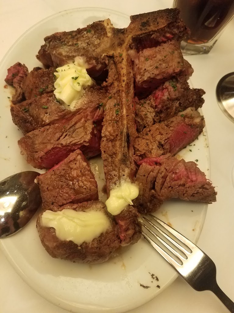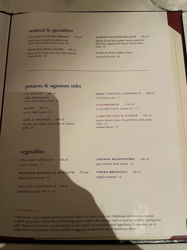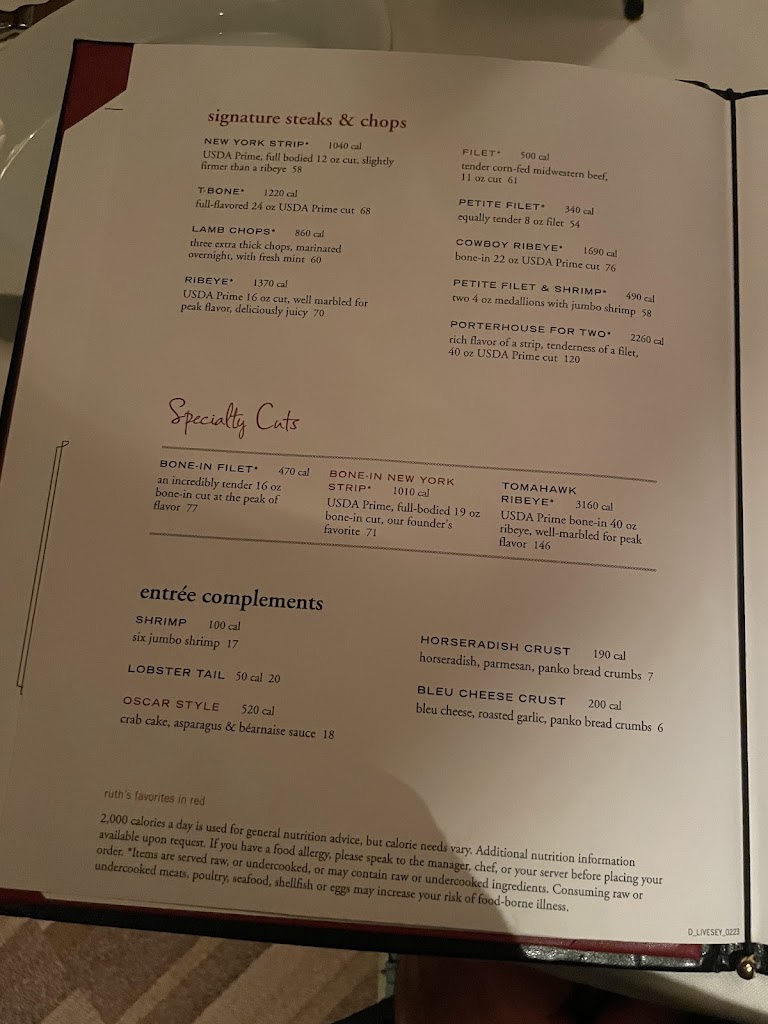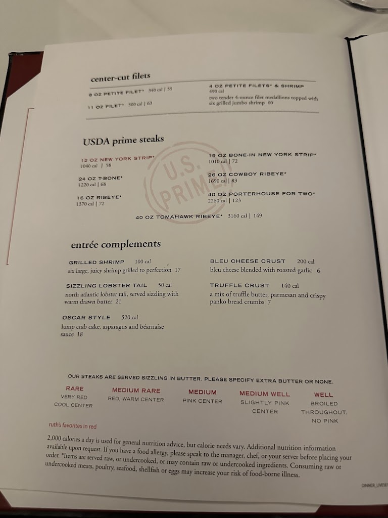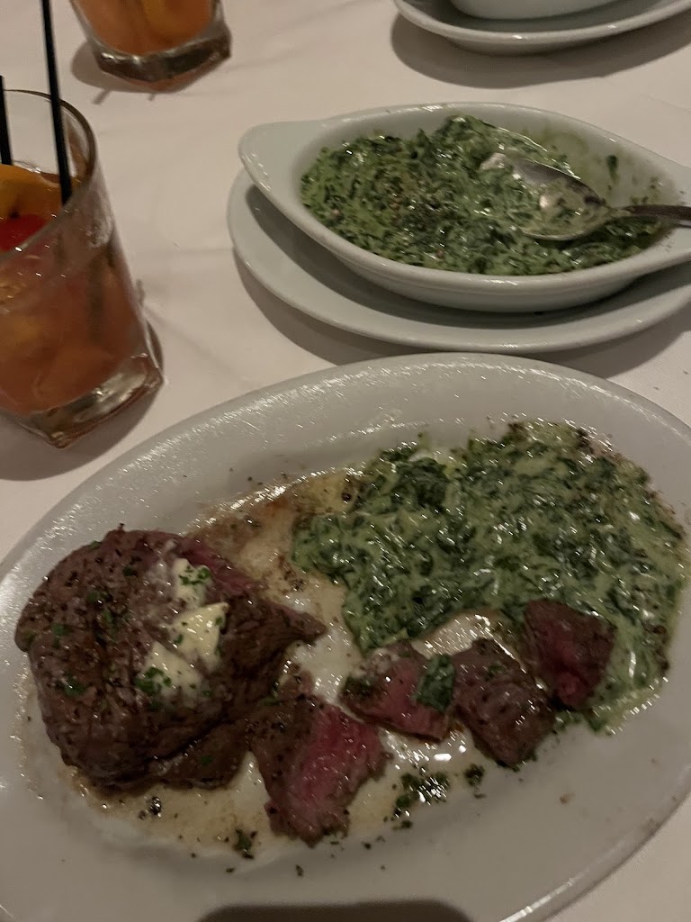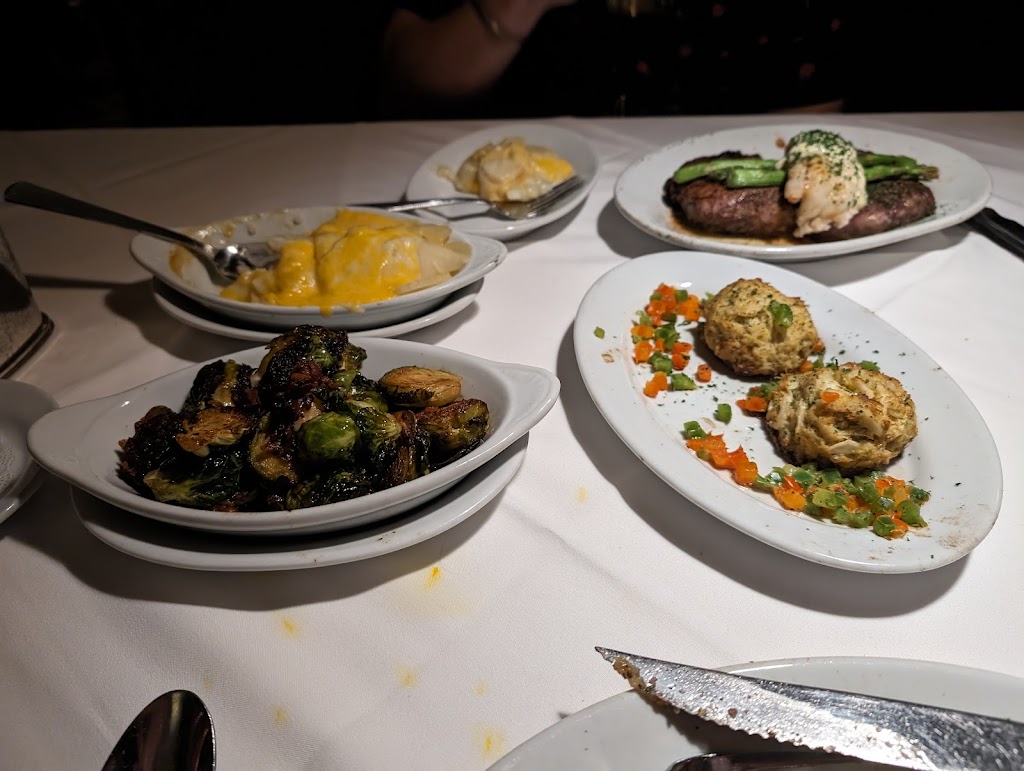 I got a drink, a steak, and mashed potatoes with asparagus. Sub par food for that price. One of the worst steak joints I've visited. Staff was nice.