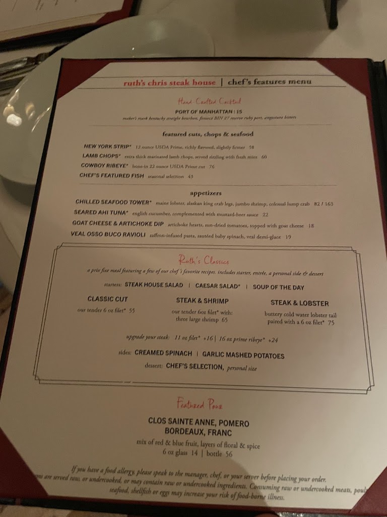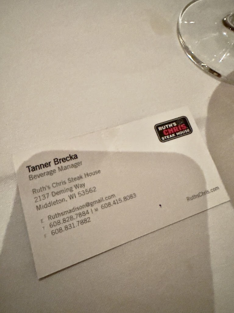 This was a long anticipated trip from Milwaukee to Madison to try out the famous Ruth’s Chris. I love a good steak and wanted to compare them to one of my favorites, Eddie Martini’s. What a disappointment on every level. We were placed in the back (red) room off the main dining area. We had to request that the manager please turn up the heat in this seemingly forgotten room. Out server was inattentive and our group of four agreed that the experience and food were…..disappointing. I’m glad I tried it, but would be hesitant to recommend.