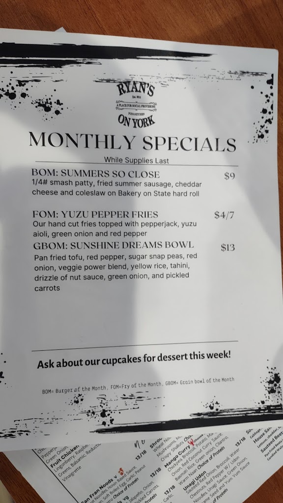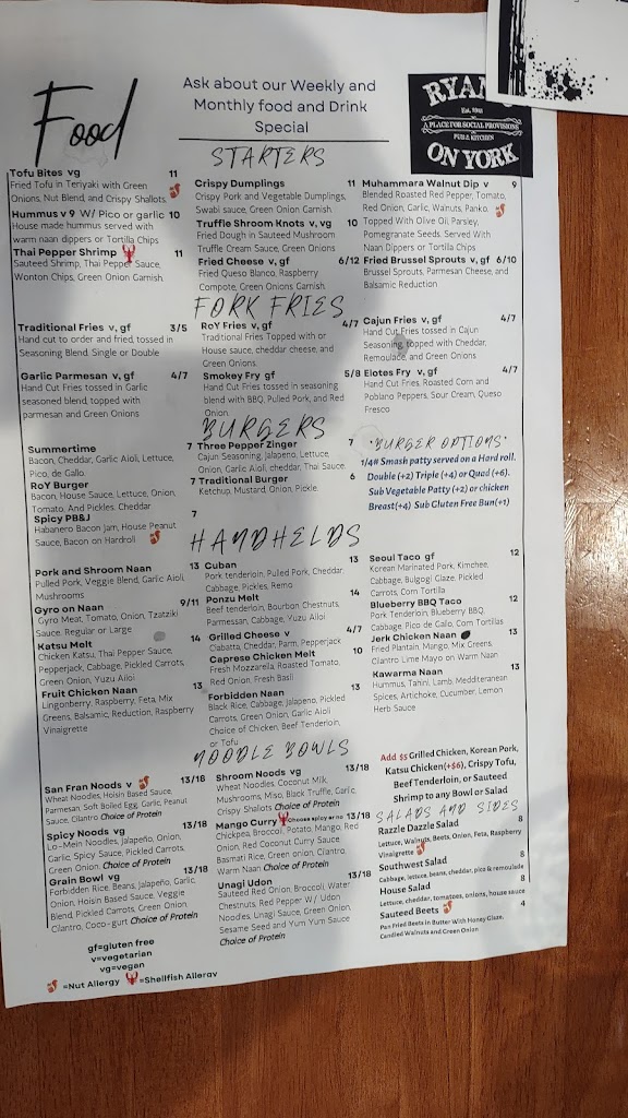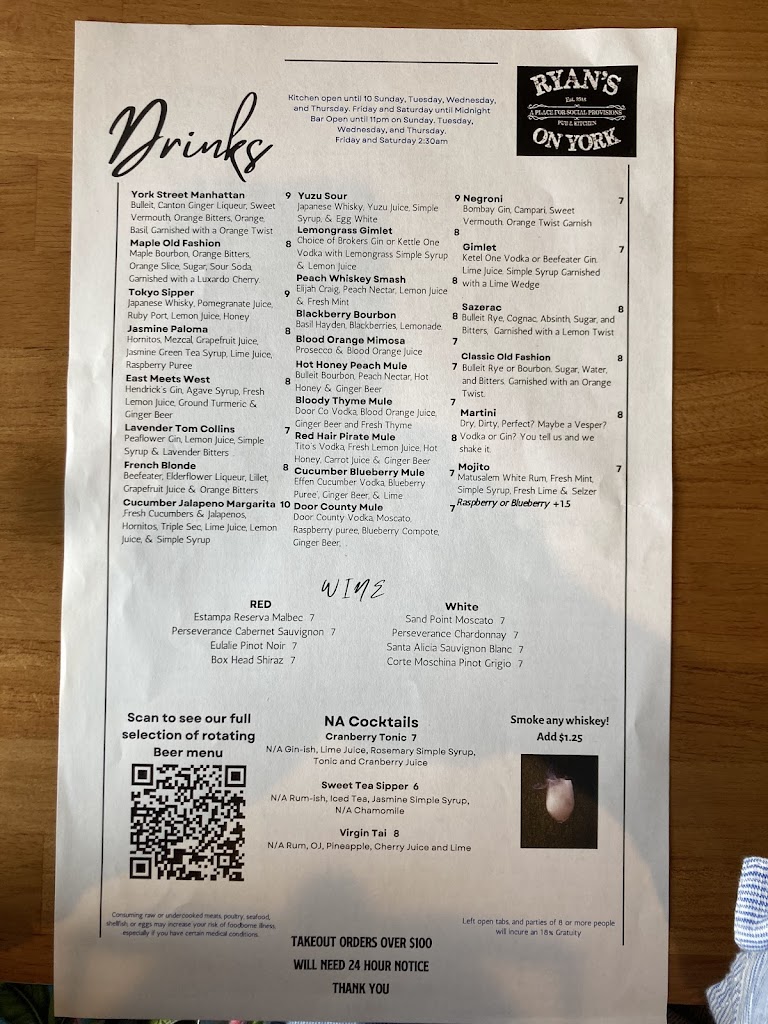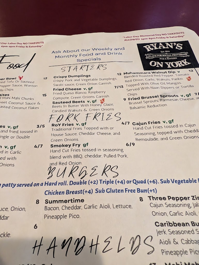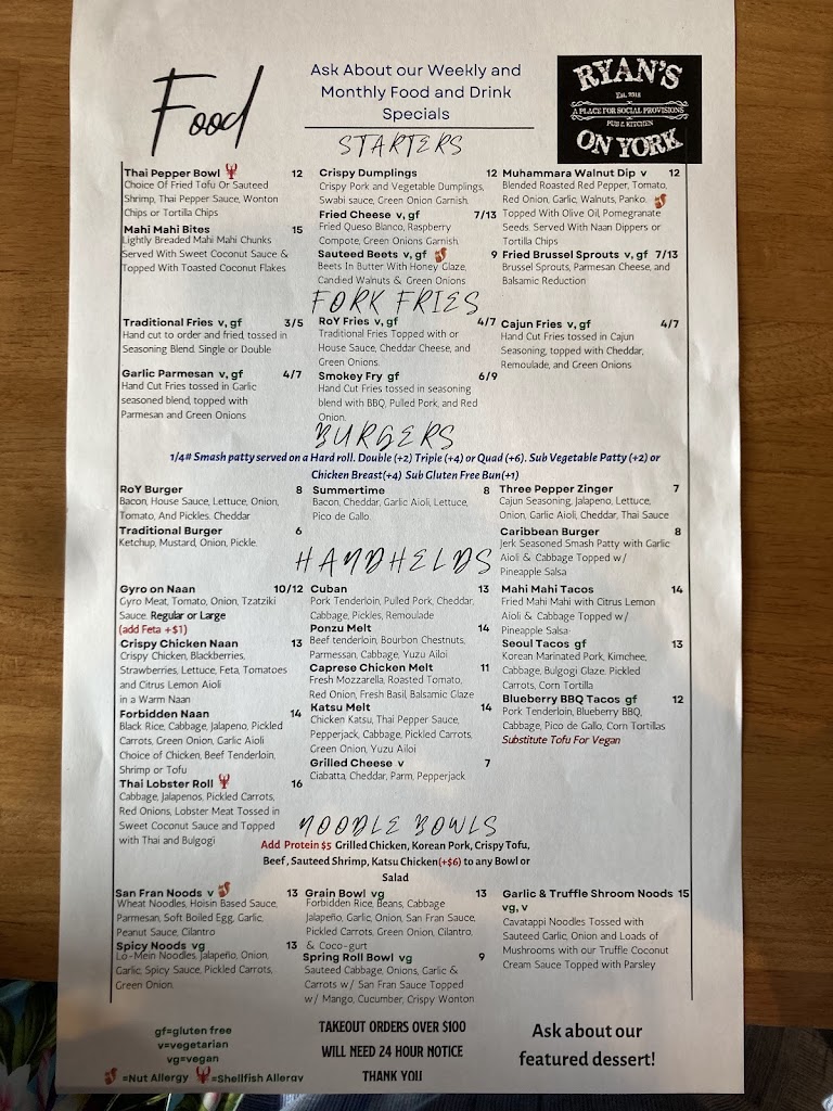 Ryan's On York left me pleasantly surprised for a seemingly simple bar. We were greeted as soon as we walked inside by friendly staff. The menu had limited variety with fair prices. The food left me feeling happy after eating it unlike most bar food that weighs you down. I'd recommend giving this place a visit if you have a smaller party, as it isn't the biggest place.
