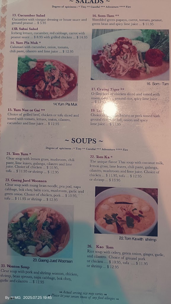 Curry was delicious; the larb was good, but could have had more flavor. Service was excellent.
