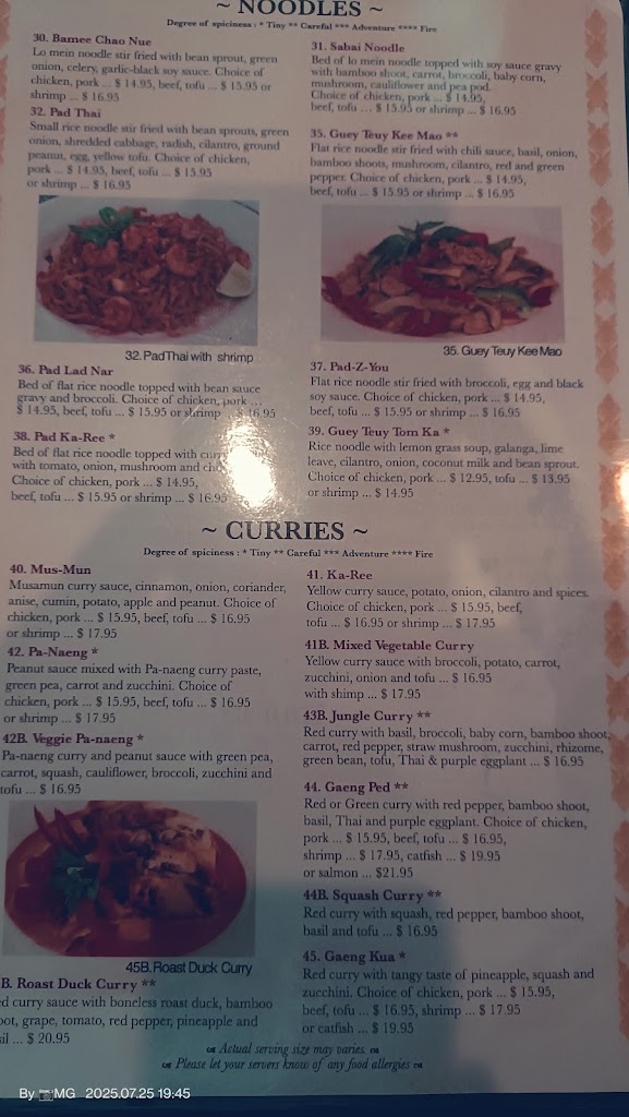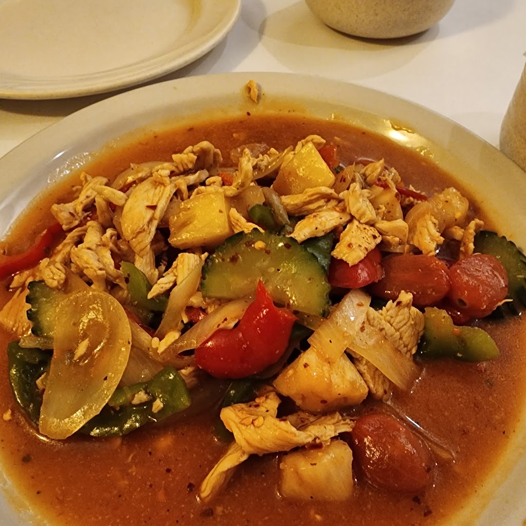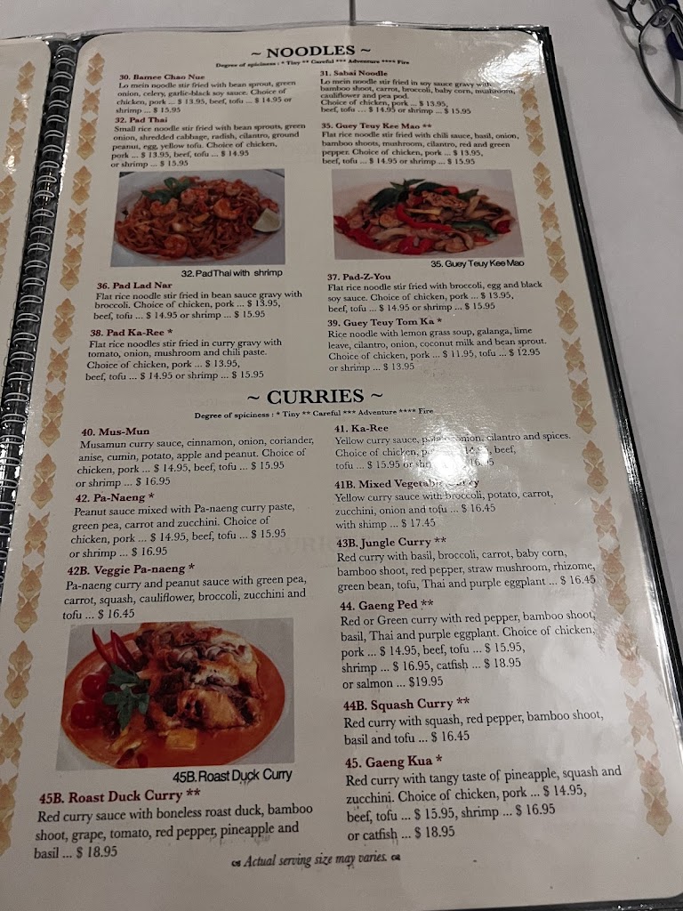 The people working at this establishment were very kind and hospitable. When we arrived, we were informed that the menu that’s online reflects their other location and not the current location as there were a few things we wanted that they do not serve. We ordered 5 dishes for takeout, 1 of them being duck curry. We didn’t receive any duck in the order at all. What we received was a vegetable red curry with pineapple. We paid $20 for that dish alone. We also ordered the Pad Lad Nar - do not recommend as the dish was soupy and the noodles were soggy. The dishes we did like were the jungle