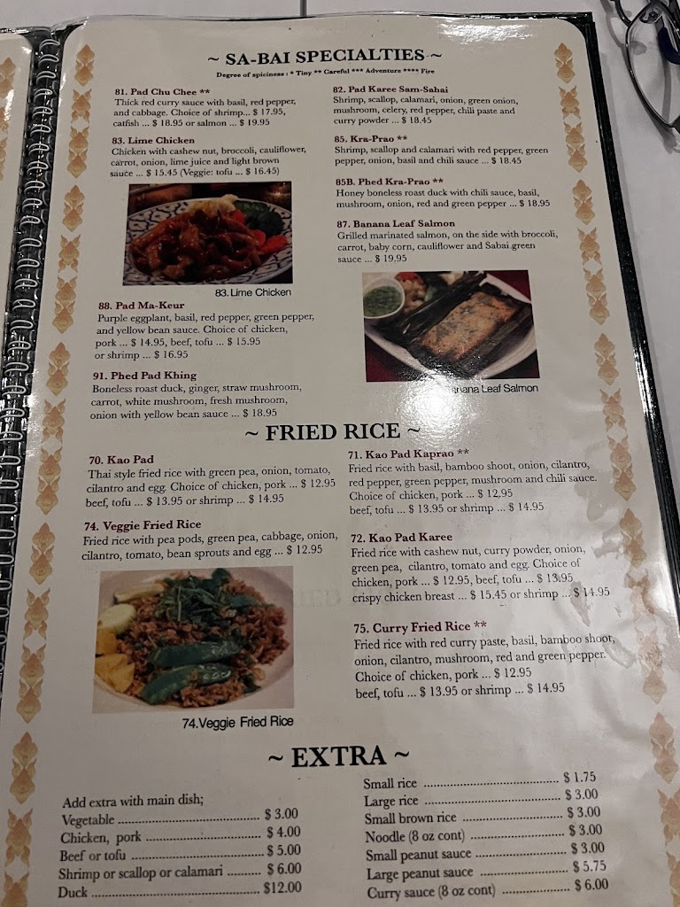 Nicely decorated and clean restaurant. The Thai food was well seasoned and spiced. We got level 4 and that had the perfect spiciness that was flavorful and fresh.