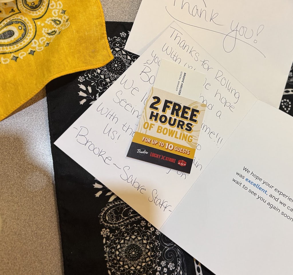 While family was visiting from Denver, we decided on bowling on a rainy day. Sabre Lanes had just opened and we piled out of the car to the door. A fun place to bring the kids. Everything was clean and a friendly staff. Perfect family place to spend quality time with family or friends. My only concern was the price. A bit more than my budget expected.