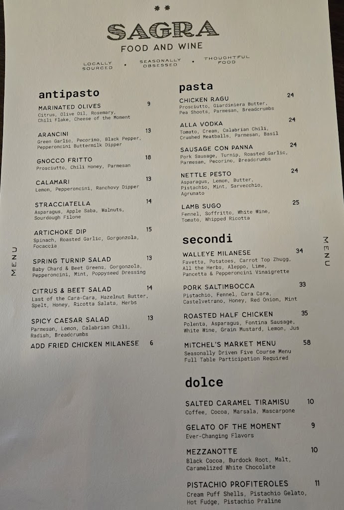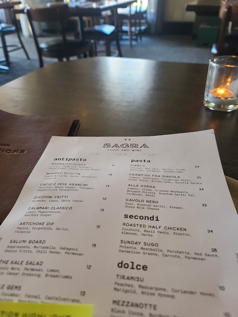 We had a wonderful anniversary dinner at Sagra! Excellent food, service and drinks. The Alla Vodka pasta is my favorite! Always a changing menu and frest ingredients. It's nice that they take reservations as well. Highly recommend.
