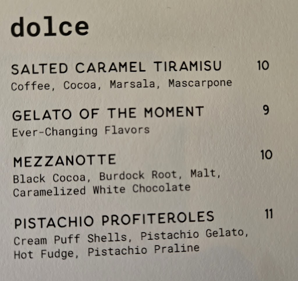 We had the salted caramel tiramisu! Wonderful! Plan to splurge on dessert!