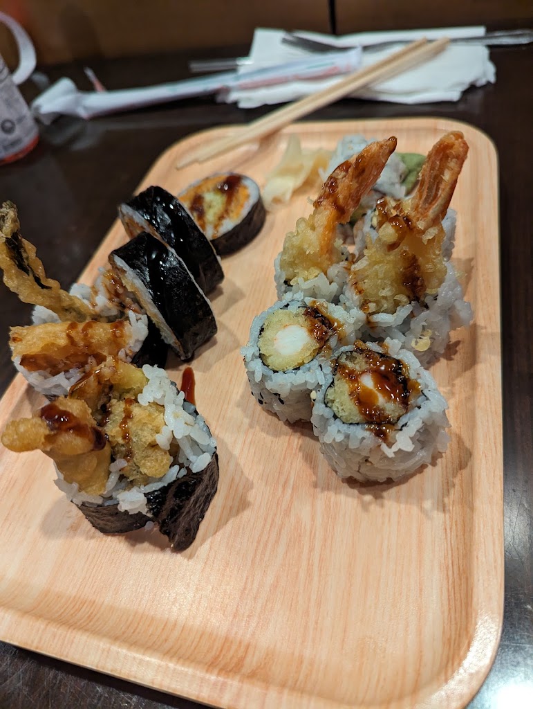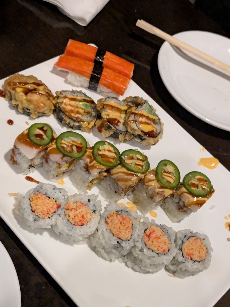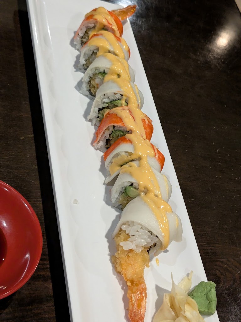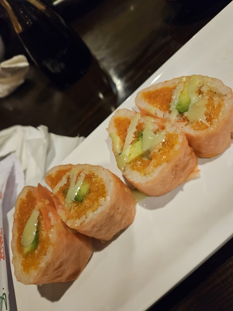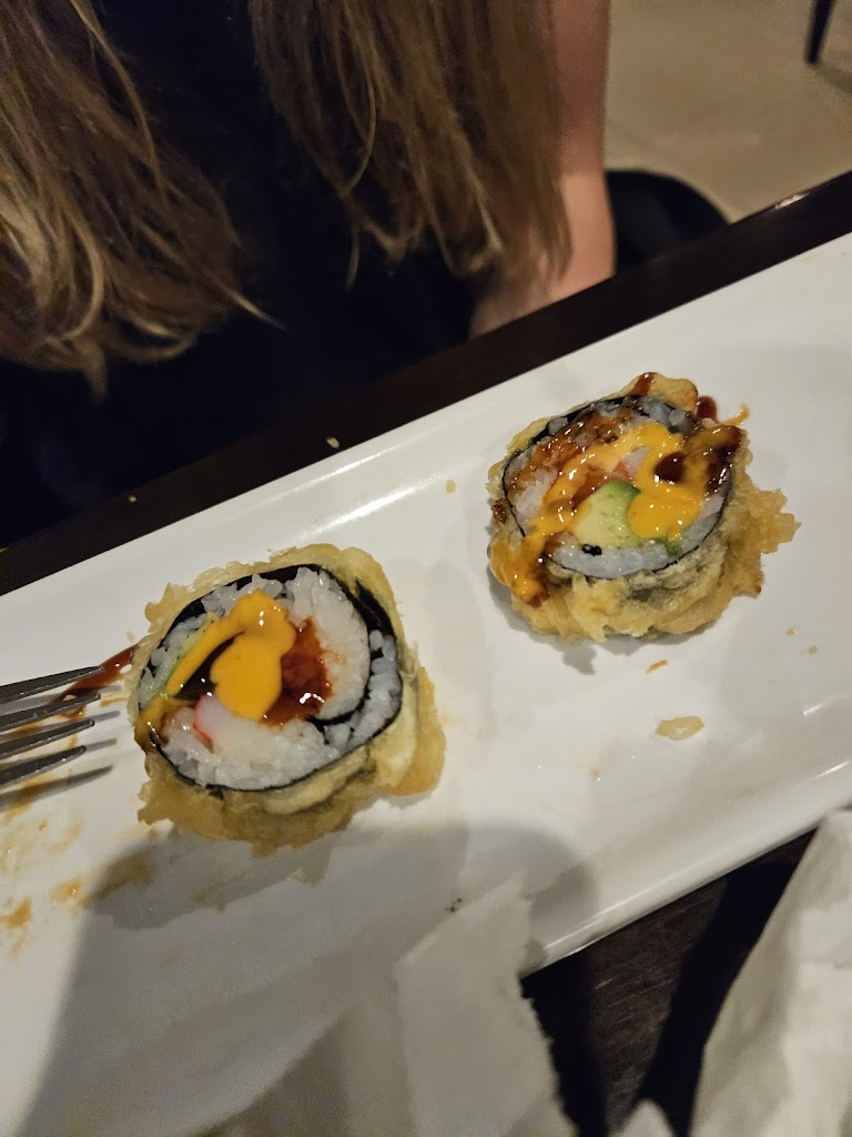 Our waitress was lovely, she was very attentive and ensured we were good throughout our visit. My partner and I thought the food was okay. The Gyoza appetizer was our favorite part. I had the yellow fin roll and spicy tuna. He had the Snow Stone roll. Yellow Fin was pretty good, I would’ve ordered that instead of the spicy tuna had I known. The spicy tuna is generally a classic favorite of mine; however, the chewiness and flavor of the “tuna” had me questioning what seafood I was eating, it reminded me of imitation crab. My partner’s roll did not state it came with shrimp tempura, but that is what came with the Snow Stone. I would be willing to try the hot food next time, but the quality of the sushi is not worth it.