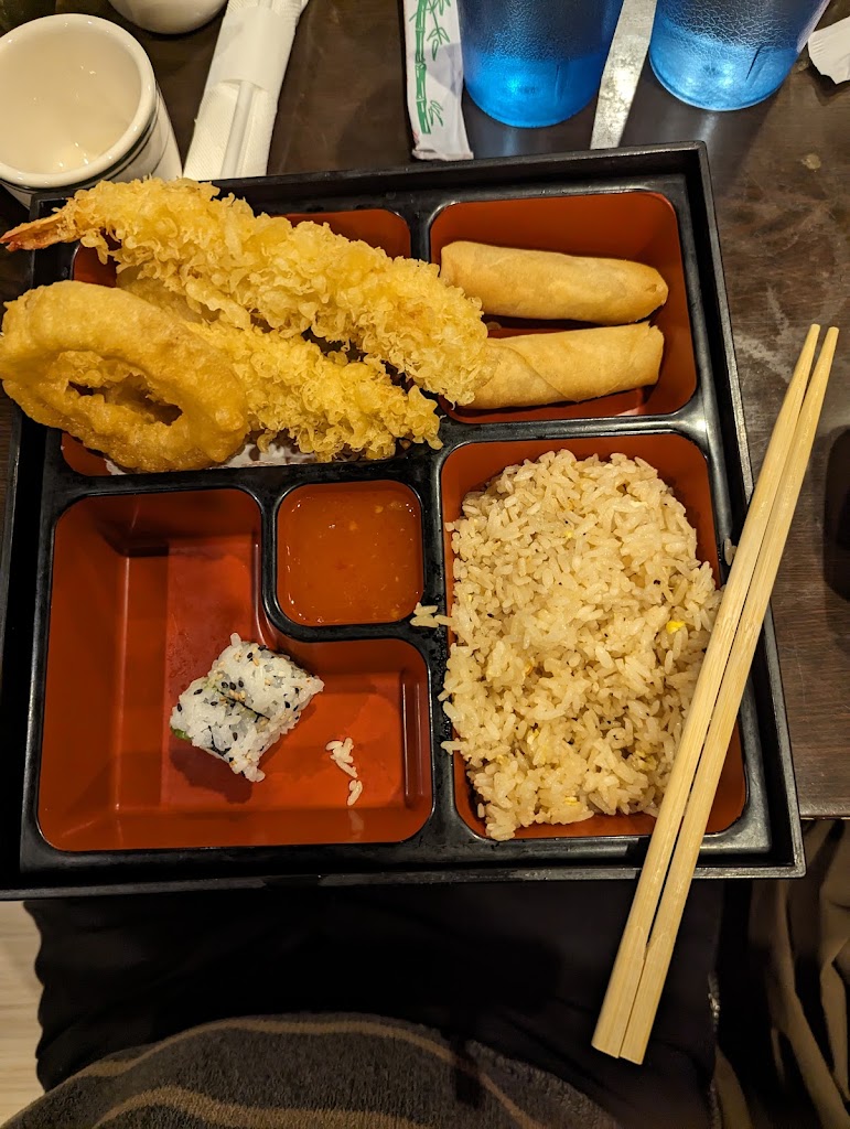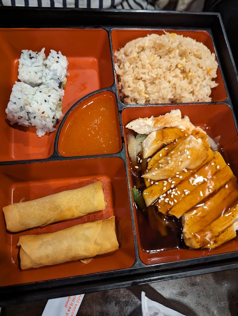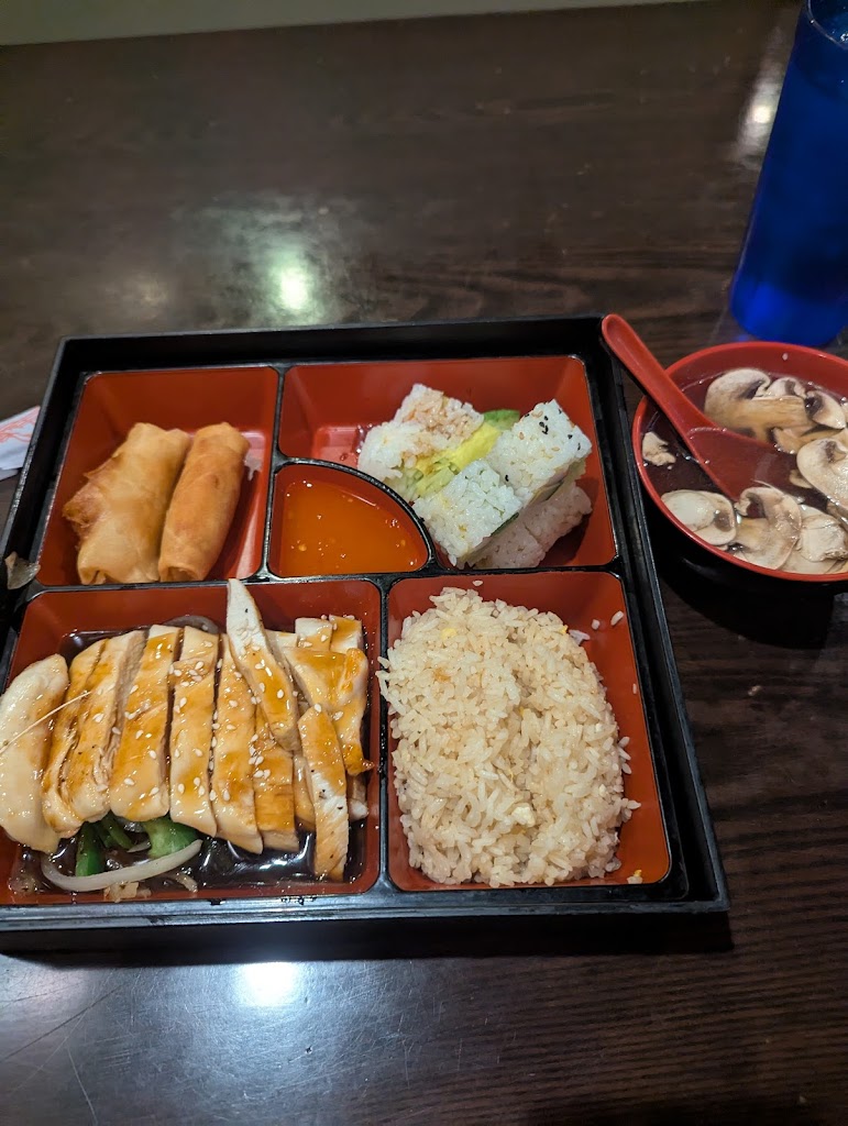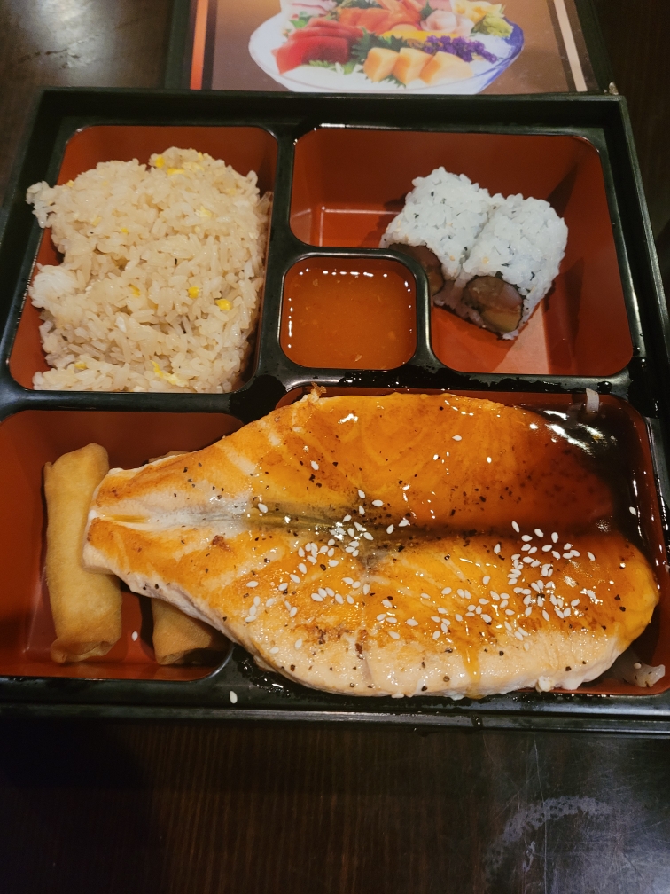 Food was ok. Service was quite slow. I think it 15ish minutes before we were greeted by our waitress. We knew what we wanted pretty quickly. We placed our order and to the waitress’s credit, she repeated it as we ordered but yet after a total time of 50 minutes, 2 of the 3 bento meals we ordered were brought out as well as the sushi, so we had to ask the waitress about the 3rd bento. Long story short, it was not that busy inside with maybe 2 other tables with guests. I’d be very hesitant to come back here. The sushi was ok and the bentos weren’t terrible. Not worth the price we paid.