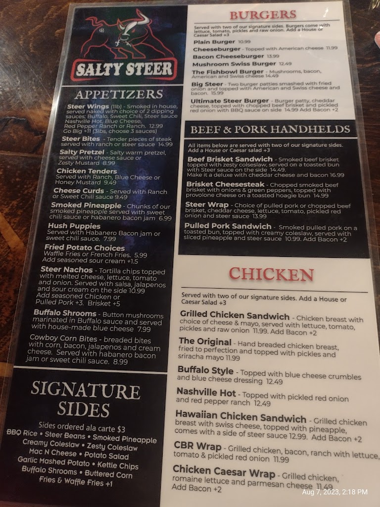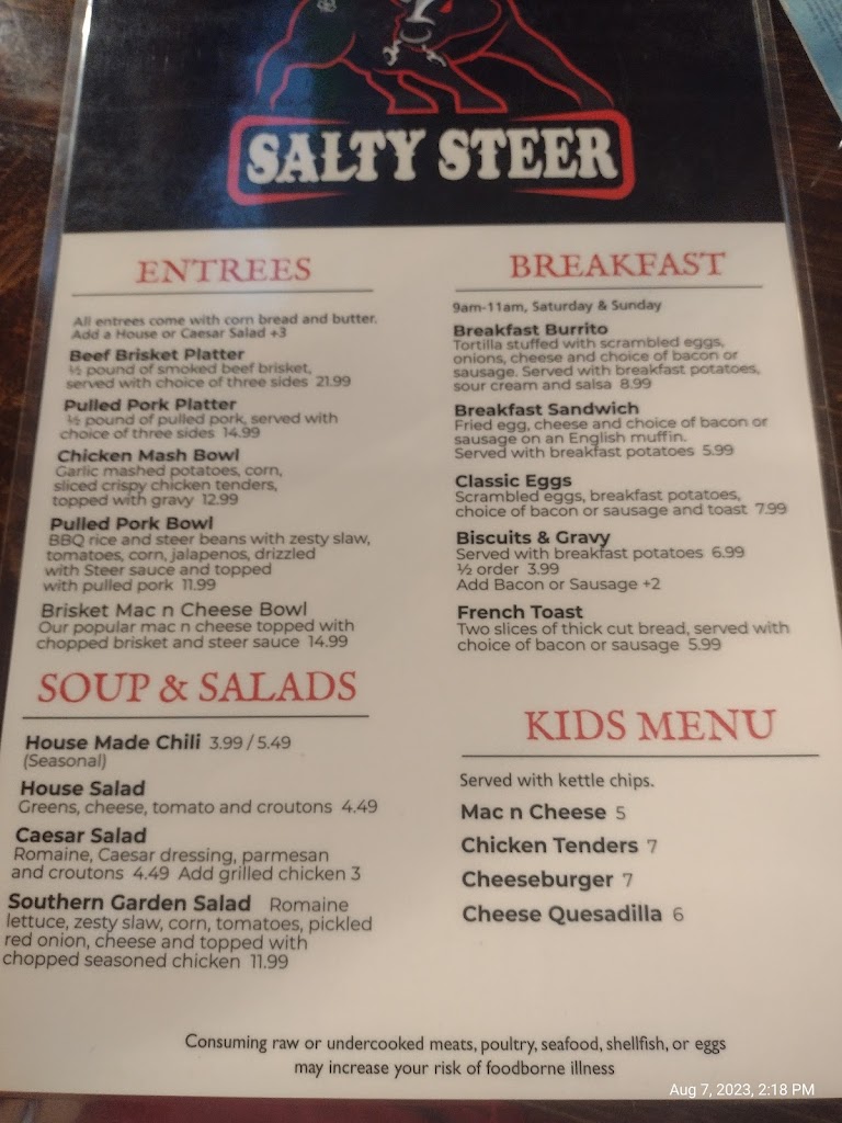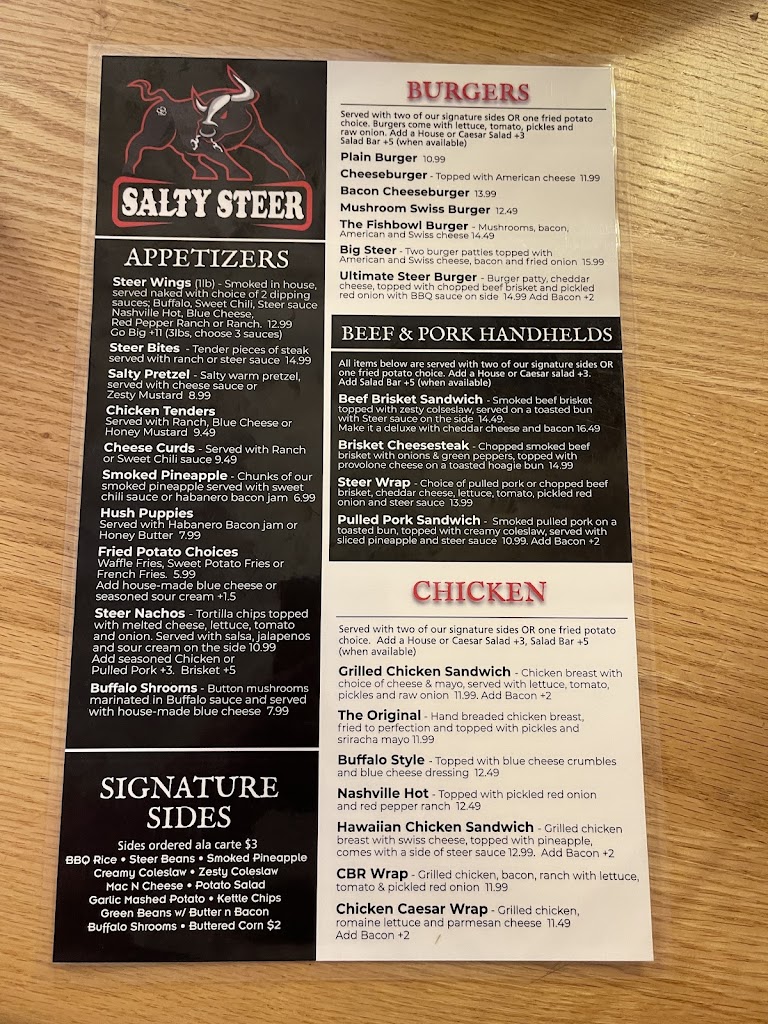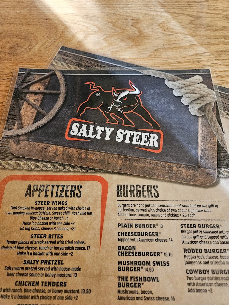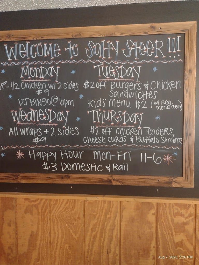 Love Salty Steer, however our last visit was disappointing. Service was not good, we obviously sat in the wrong section it took way too long to be acknowledged. WE've always had great service before. Food was still perfect. We will go back often but sit in our usual section. To be fair it was busy and staff was short.