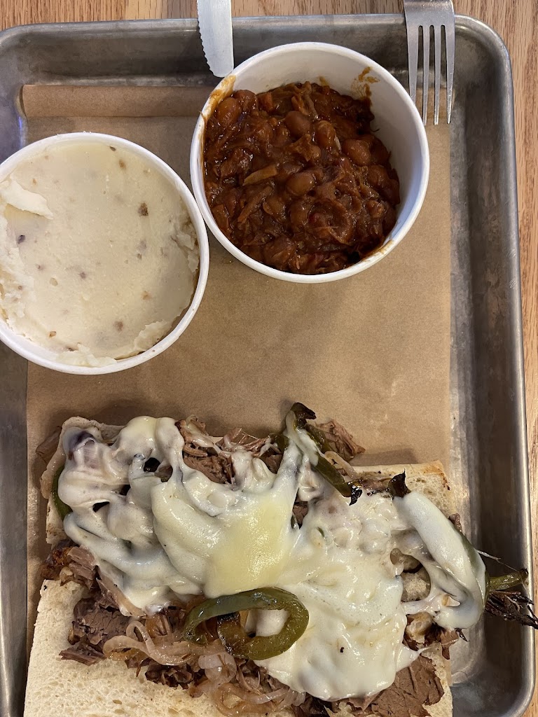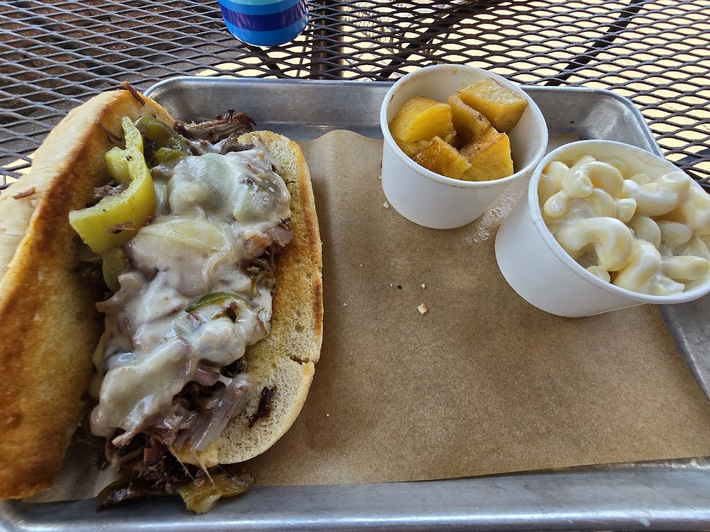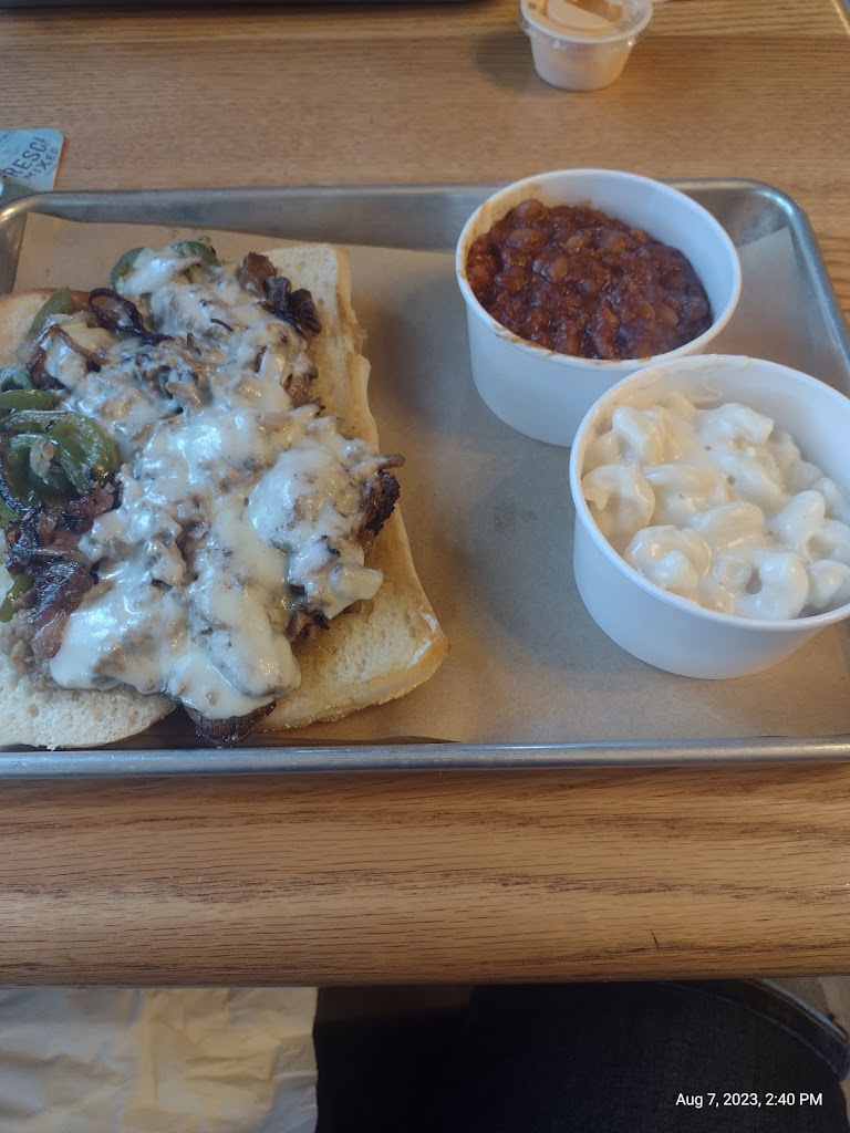 Stopped on a Friday evening with friends for an early supper. We enjoyed the hush puppies as an appetizer. Came with 2 dips and both were delicious. For our meals we had the pulled pork sandwich, brisket cheesesteak, and a wrap made with the brisket. For our sides we did potato salad, beans, waffle fries, garlic mashed potatoes, and Mac and cheese. It was all really good. Great service. Nice atmosphere. Would be family friendly if you have the family with you. Nothing bad to say about the experience!!