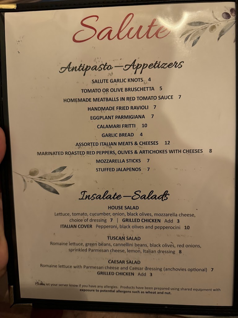 Updated Review - 4/28/23: We went to Salute with some friends of ours. We sat at the bar and ate…. and had a great time! The food was delicious! The service was incredible…. fast, helpful, and friendly! I had my favorite dinner choice…. the meat lasagna! My wife had the Chicken Rigatoni. Our friends had the special pasta of the night and a sausage pizza. Everything was perfect…. including the salads and soup. We love Salute! I highly recommend eating there!