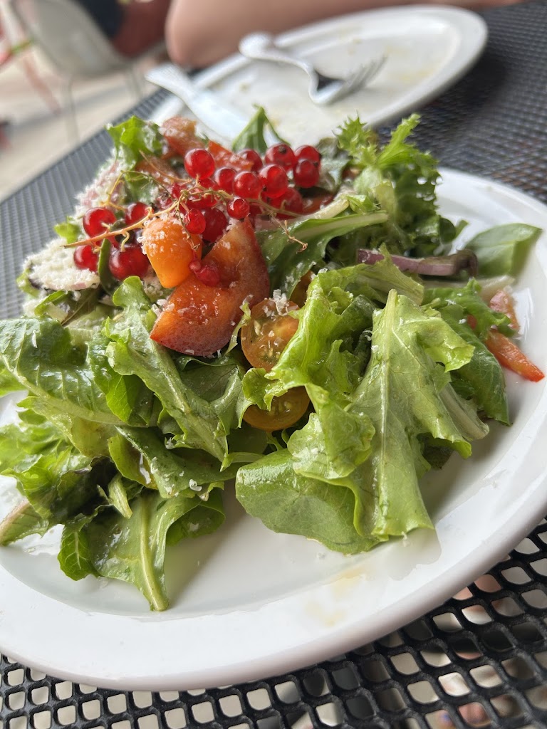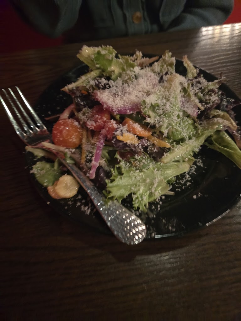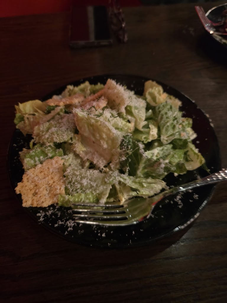 When our waitress returned, we ordered. A couple of pizzas, a salad, and a half Caesar salad. The half salad was delivered in just a few minutes and my friend who ordered it said it was delicious. Filled with parmesan chips, it looked amazing!