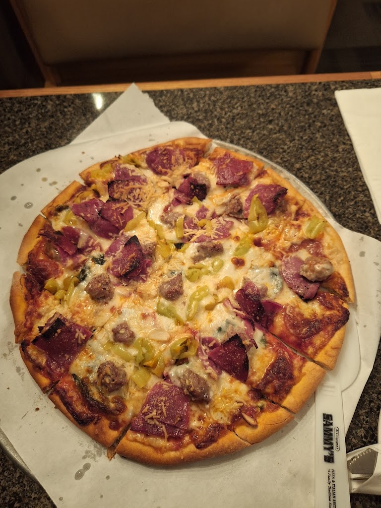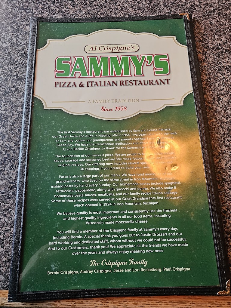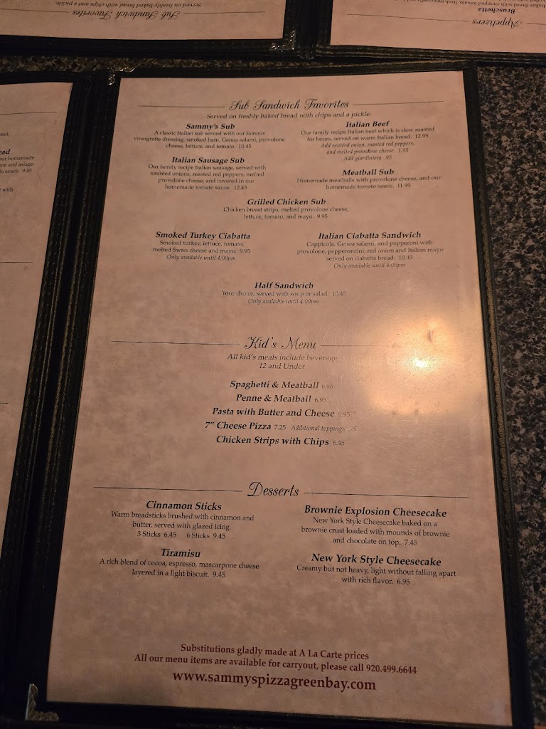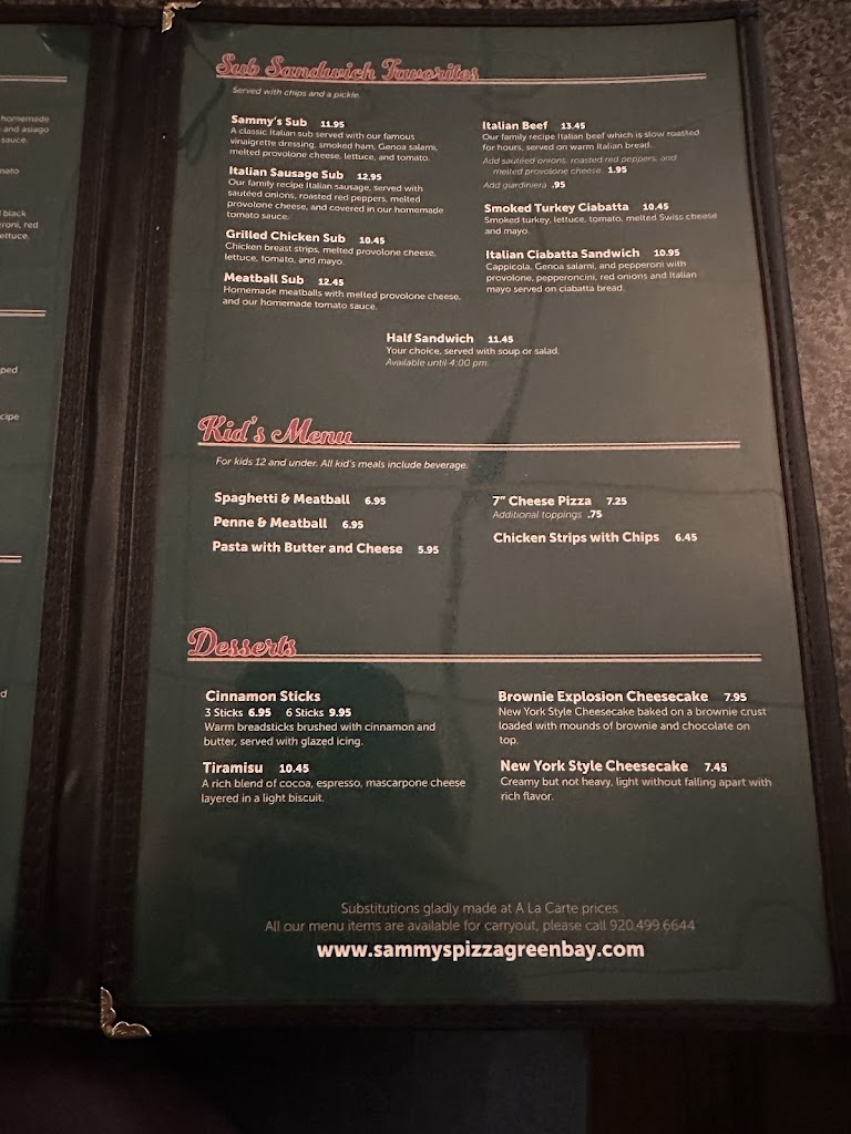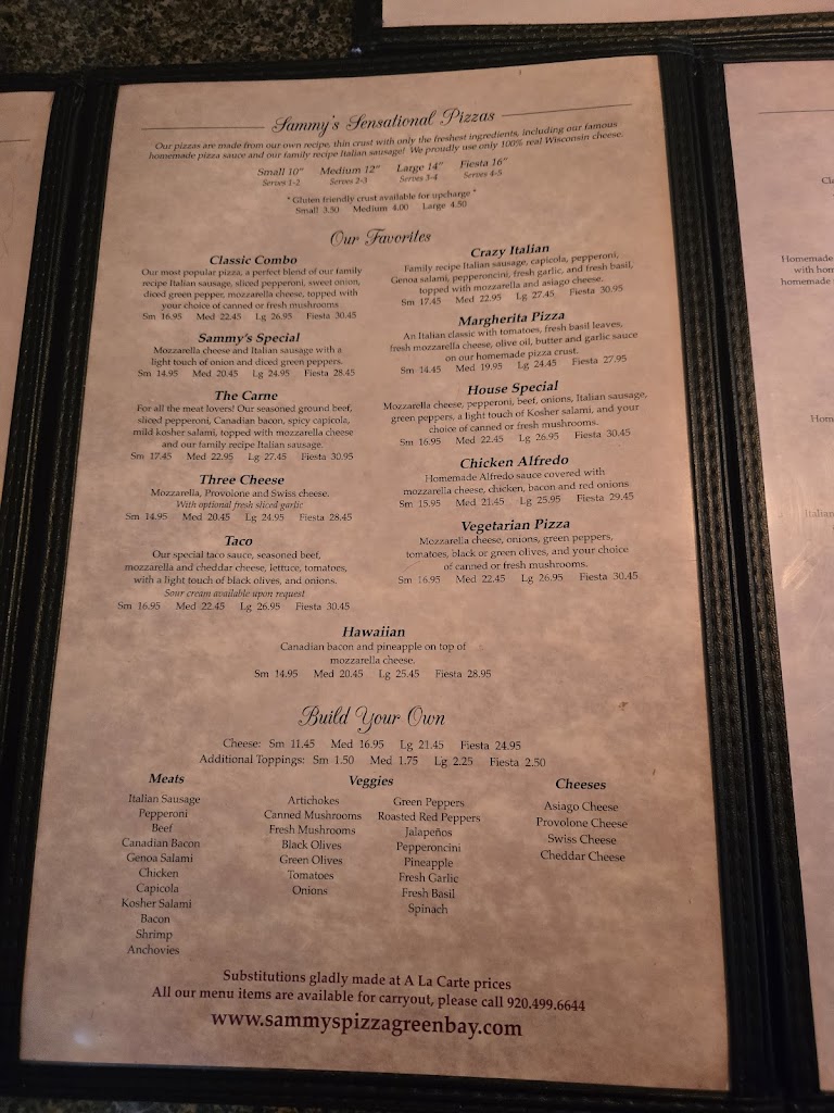 Sammy's has been my favorite pizza restaurant since I moved to Green Bay in 2007. The staff is always friendly and accommodating. The pizza is fantastic - plenty of toppings, great sauce and a nice thin crispy crust. Cheesy garlic is so delicious 😋 They have a nice variety of home made Italian food too. It is a very family friendly restaurant. Highly recommend Sammy's Pizza!