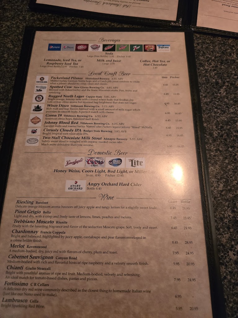 Had supper here twice during my travels through Green Bay in June 2025. Outstanding Service and Delicious Food. The owner suggested several meals on the menu and I experienced a pizza recommendation and a pasta recommendation, which were both amazing. Excellent portions at a fair price. The teamwork concept of all servers helping each other was unique and exceptional. Definitely will eat here again!