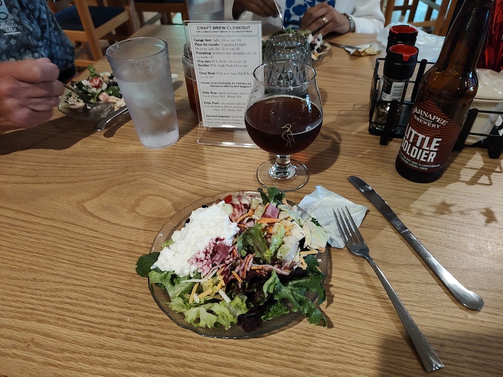 This is a nice cozy place with plenty of space. The tables are spacious with a focus on comfort rather then people craming which is a nice change up from the usual crowded dinning which is typical of most door county dinning establishments. The bar is retivliy small accommodating only abot 7 people. Despite its small size it boasts a impressive liquor selection as well as some craft beers. There is a small salad bar which is a little underwhelming but it would satisfy the basics.The crowd seems to be a mix of older and middle aged groups of 4-6 people. The menu has a generous amount of options that that seem like elevated takes on alot of door county favorites. So tonight I'm trying the half naked cheese curds, jumbo smoked wings in the pablono cherry BBQ sauce, the home made sea food chowder, and the cod dinner plate. The appetizers where amazing. The cheese curds where very good and the magic sauce was a real hit. The smoked jumbo wings where huge, but so juicy and savory. The pablono cherry BBQ sauce was a interesting twist that went well with the smokiness of the wings.The seafood chowder was spot on with a creamy rich base and great flavor, it honesty left me wanting more. The cod dinner was done simple but exceptionally well. Two large pieces of cod with a thin and crispy beer battering.