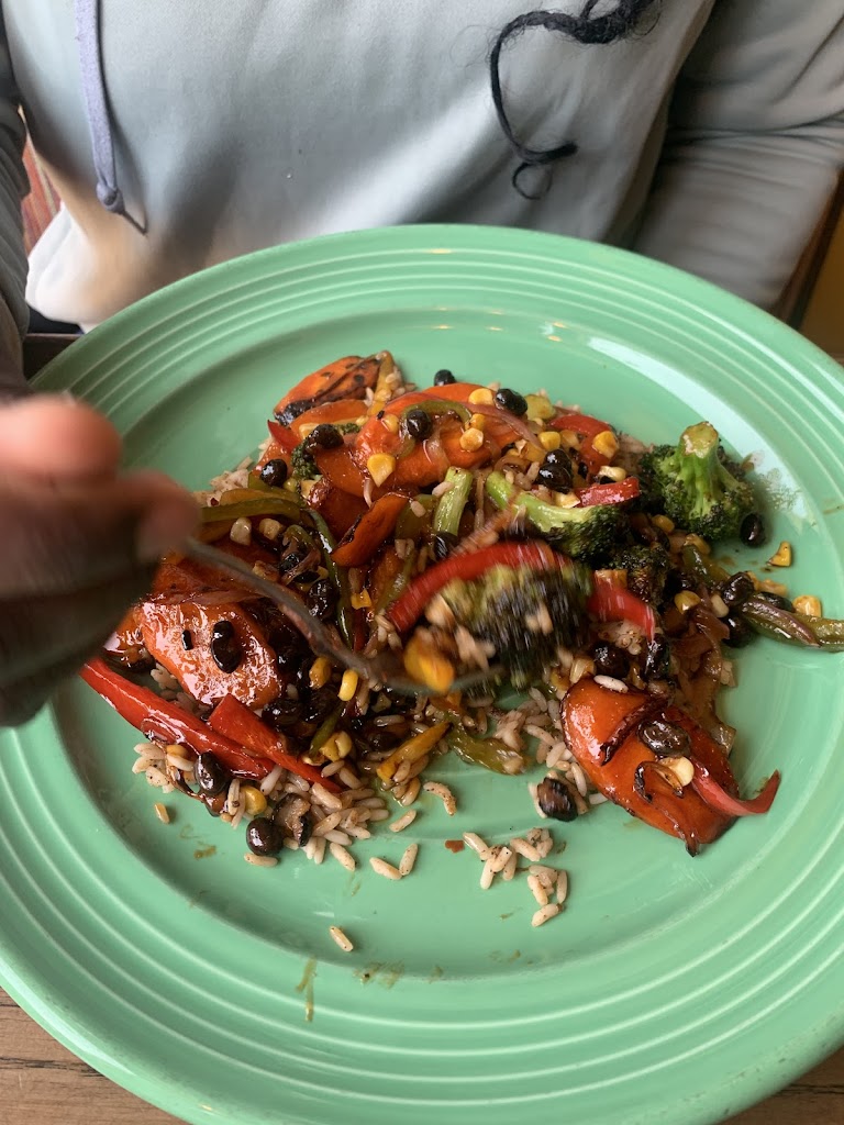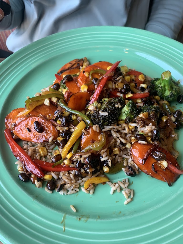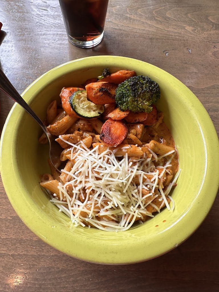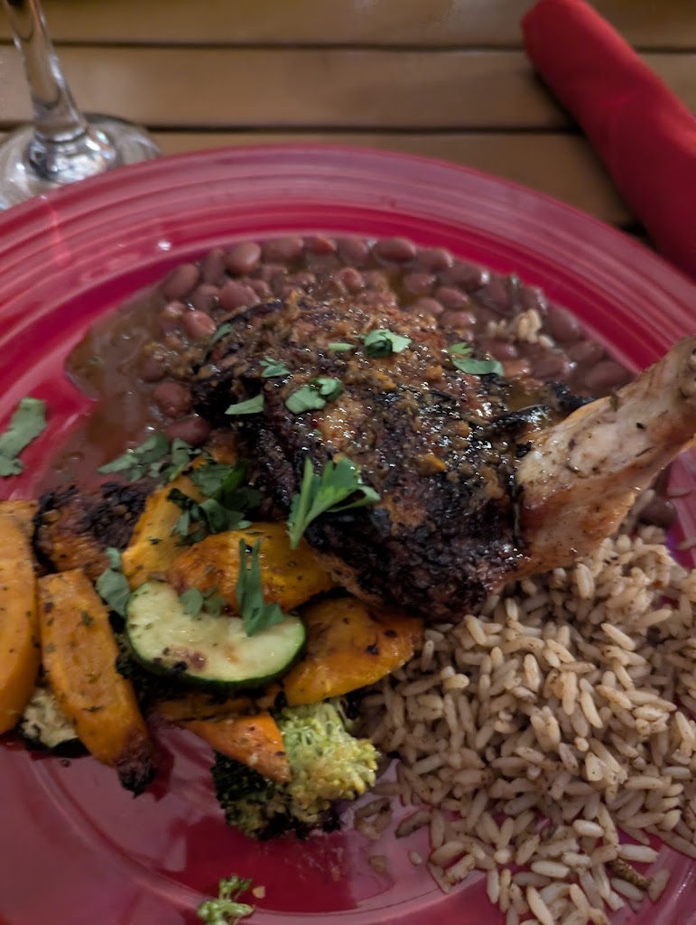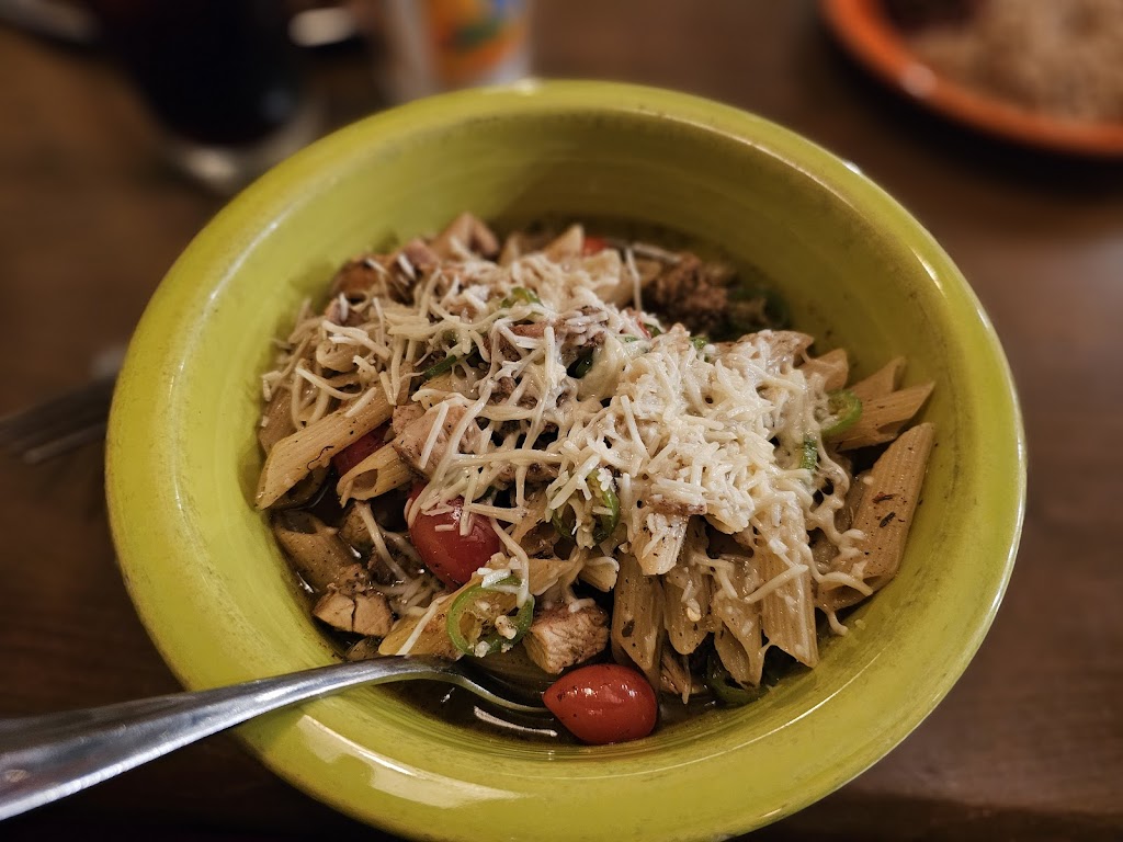 So I had been hearing so much about this restaurant that we had to give it a try. Parking wasn't much of an issue, but we also came before the dinner rush. When we walked in we were told we could sit wherever we wanted. We sat at a booth and our server came over and took our order and she was replaced by two young ladies because she was leaving. So I ordered the jerk chicken with mixed vegetables and my other half ordered the chicken chile penne.