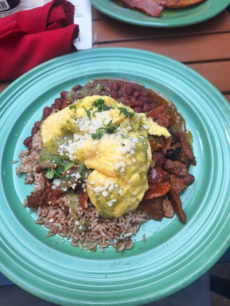I will start by saying they knocked this green chile chilaquiles out of the park. Everything was seasoned well from the rice to the beans and the overall flavor was mindblowing. I would happily take seconds of that rice because it tasted so good! The steak was super tender as well. I am not a huge spice person but the green chile sauce covering the chips was mild and accented the dish perfectly instead of being overpowering. I was a little worried it was going to be super spicy but it was just right for me. The cilantro crema drizzled over the eggs was super tasty too. Not to mention the runny yolk which was delicious. They honestly executed everything so well and each bite was just as good as the last.
