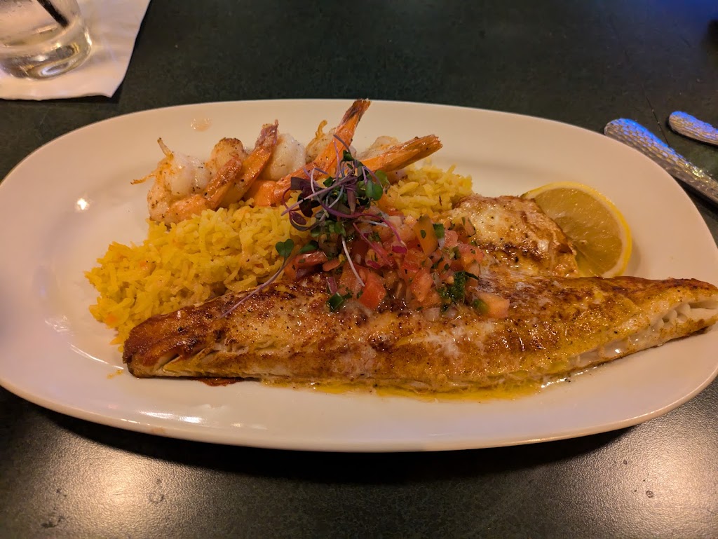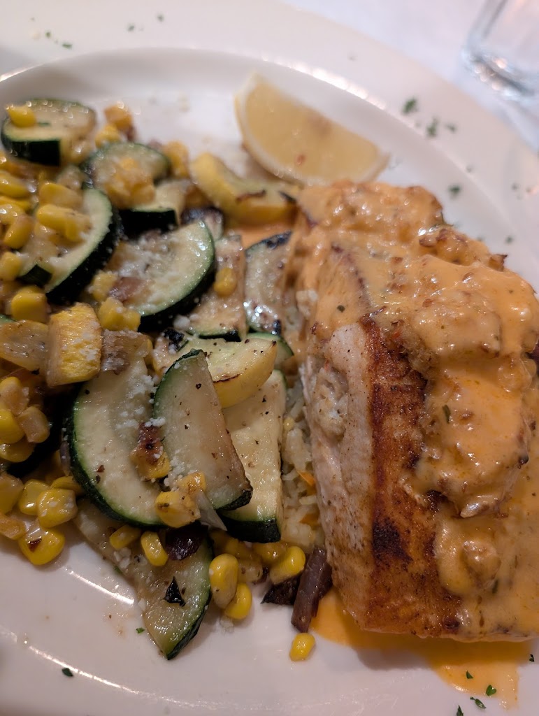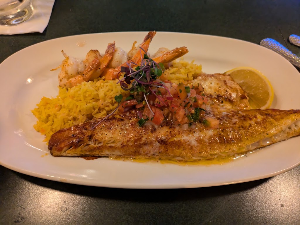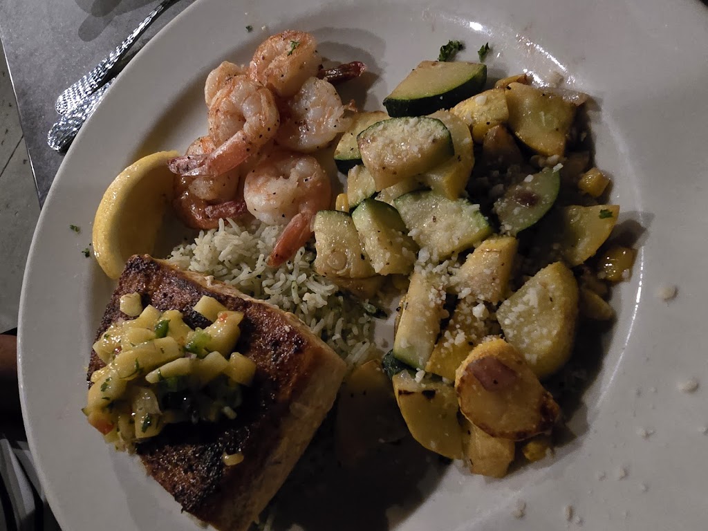 My dinner was the walleyed pike and shrimp dish and was delicious. Both items were prepared with garlic butter and served over rice. The shrimp bisque appetizer was one of the better soups I've had in a while.