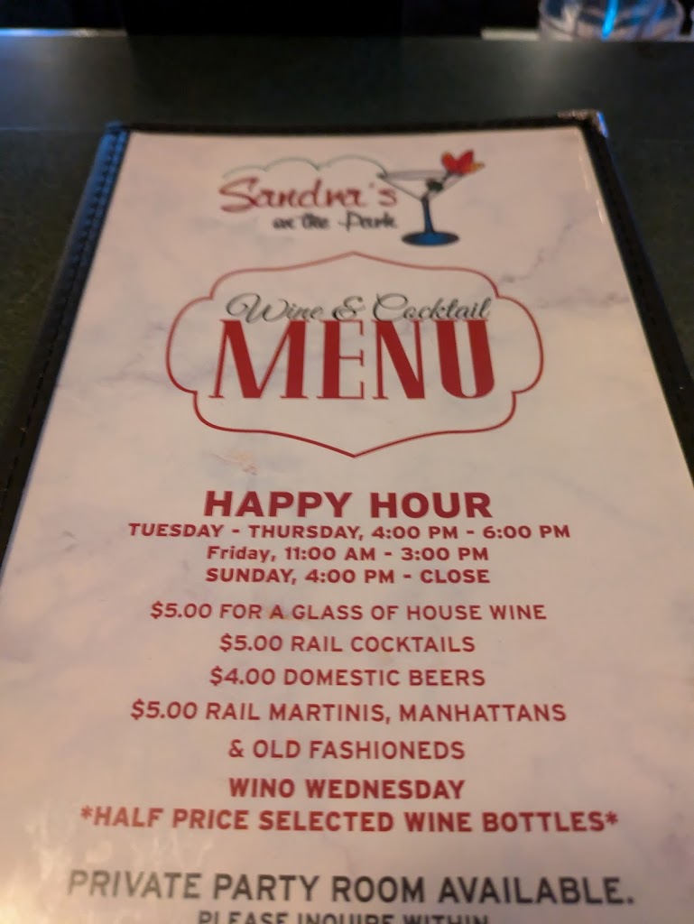 We arrived in time for a happy hour cocktail to start our evening at Sandra's. We found it odd that they don't offer tap beer which is a staple in Wisconsin bars. But our drinks were well poured and enjoyable.
