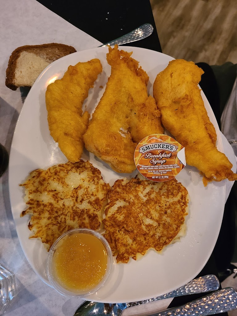 Darling place, cozy atmosphere, quick seating, prompt service all throughout dinner. Ordered: delicious Hay Stack Onion rings & Light & Crispy Beer Battered Fish Fry, served with French Fries, tasty slaw & Marble Bread.