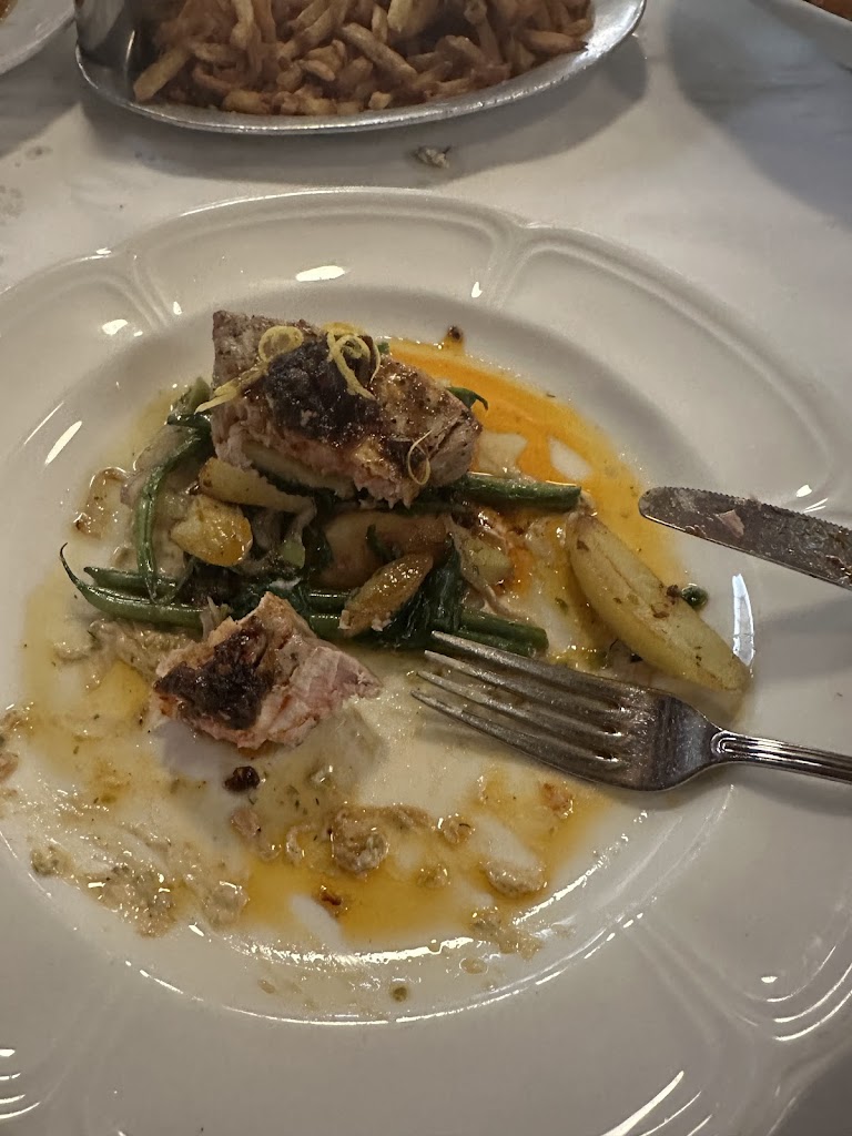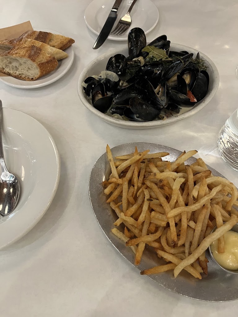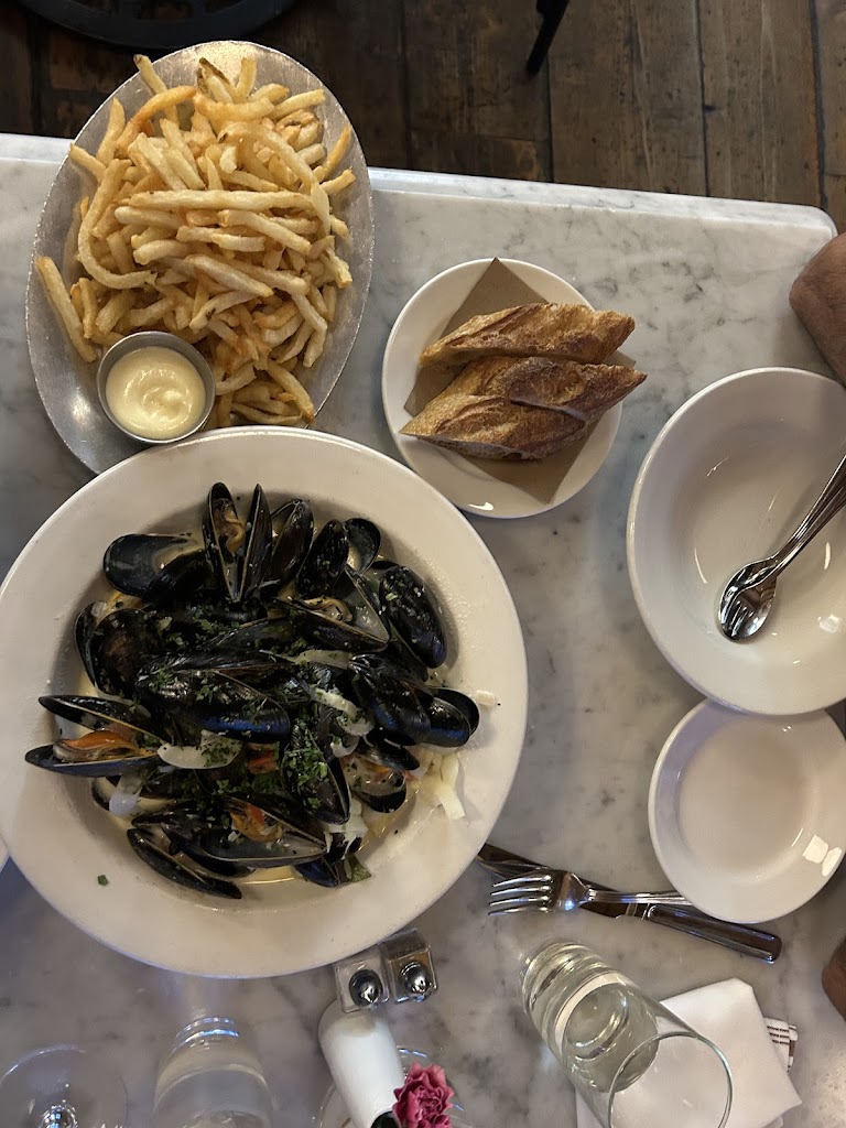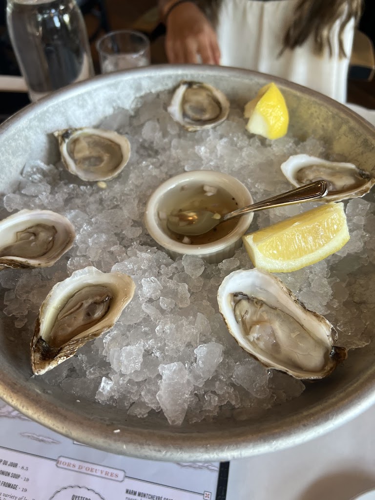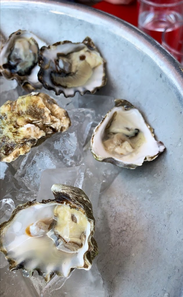 The food was delicious. Oysters, mussles with fries, sole. Salmon was too herby, but accompanying the heavy other dishes, it worked well. Cocktails good. Cheese plate good.