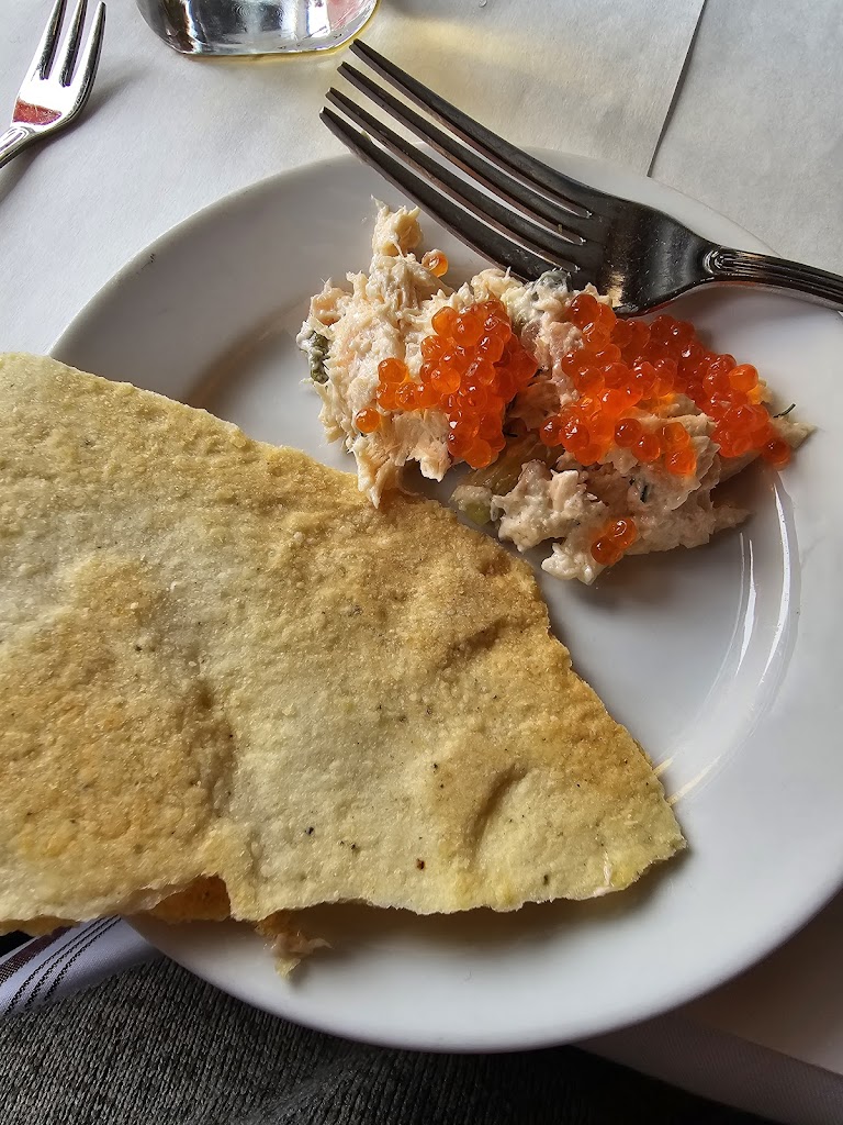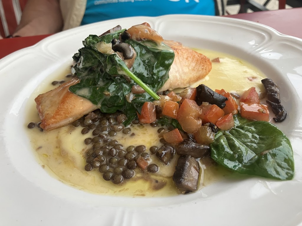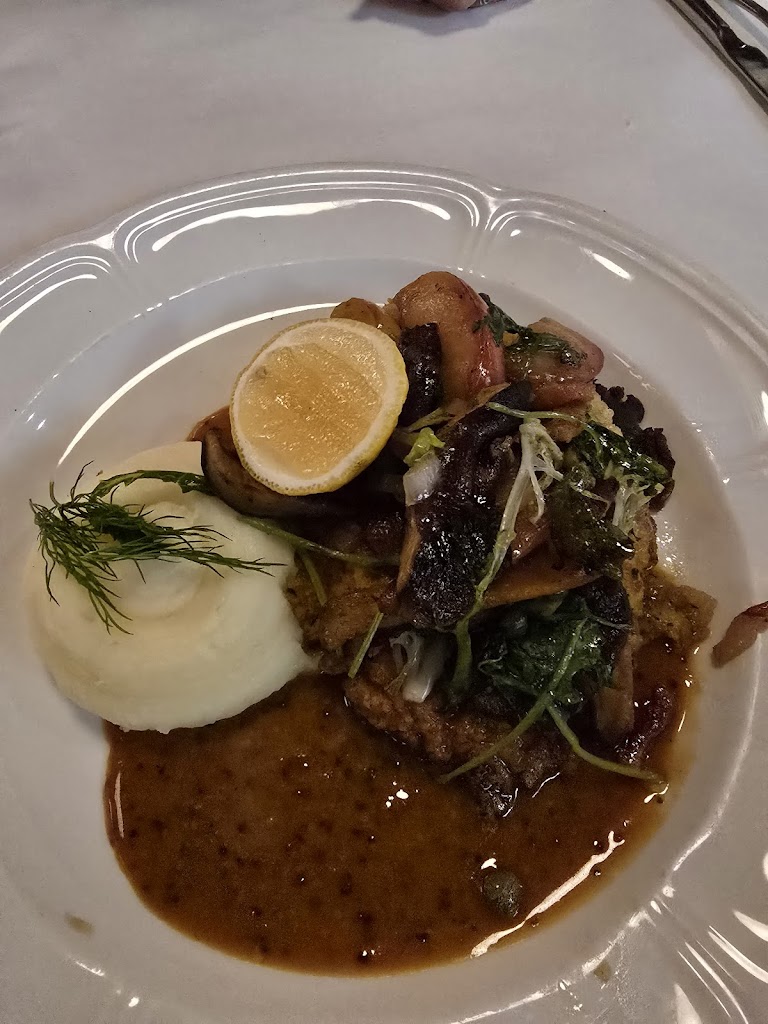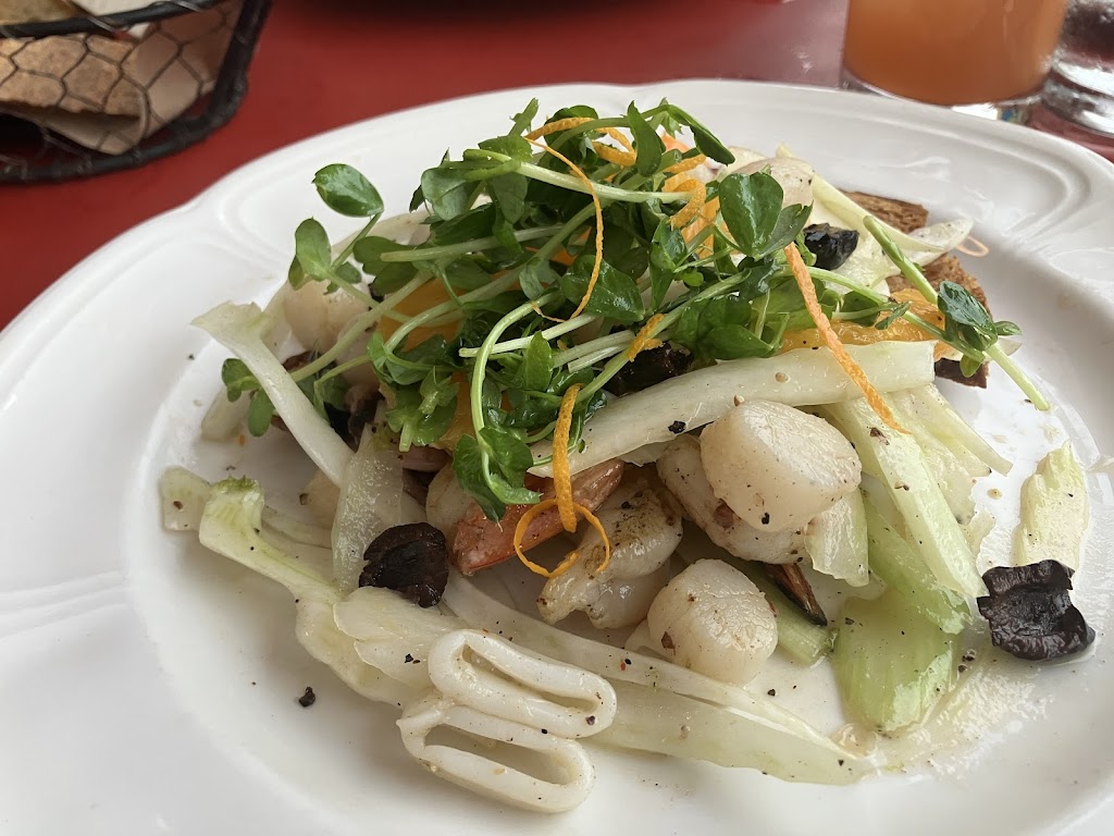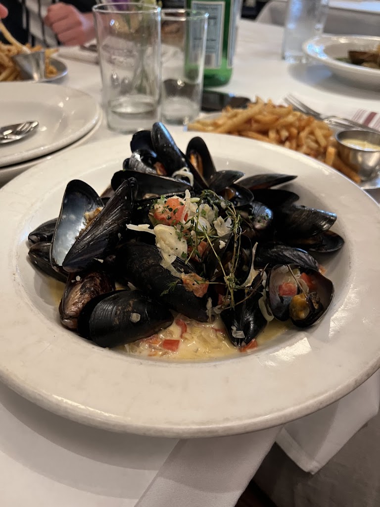 The food was delicious. Oysters, mussles with fries, sole. Salmon was too herby, but accompanying the heavy other dishes, it worked well. Cocktails good. Cheese plate good.