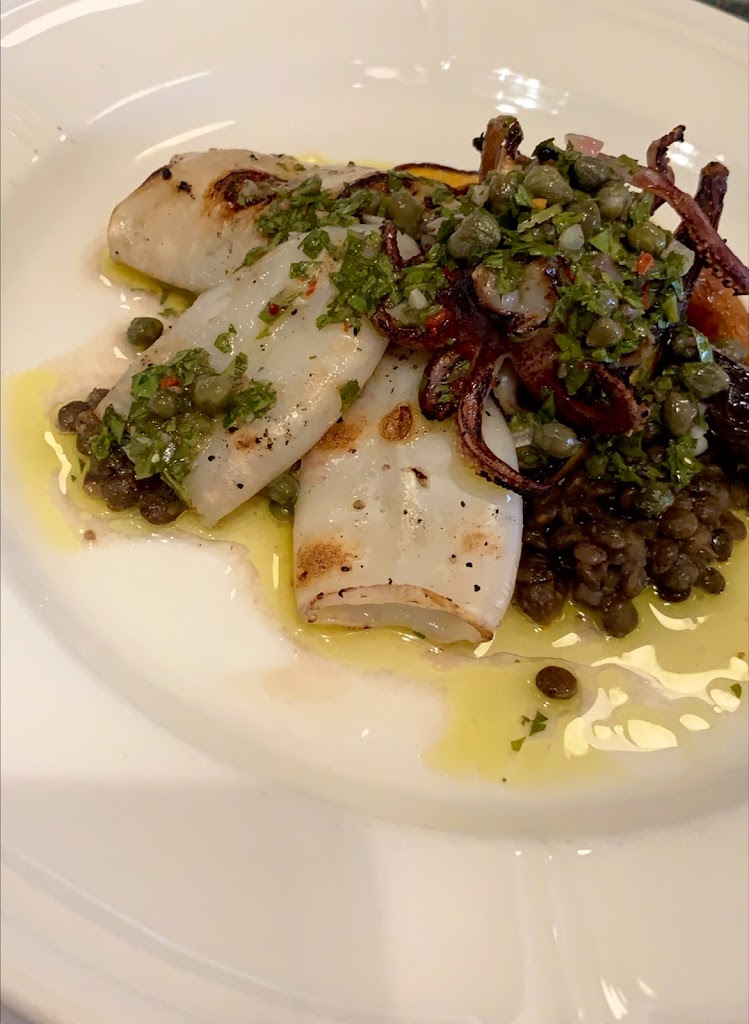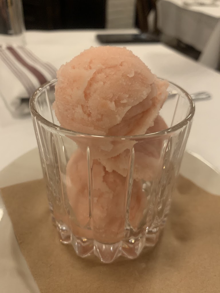 French onion soup, pork-laden bacon-finished lentils as a delicious side, sardines, gnocchi, swordfish, blueberry/basil/ginger sorbet! Interesting wine list