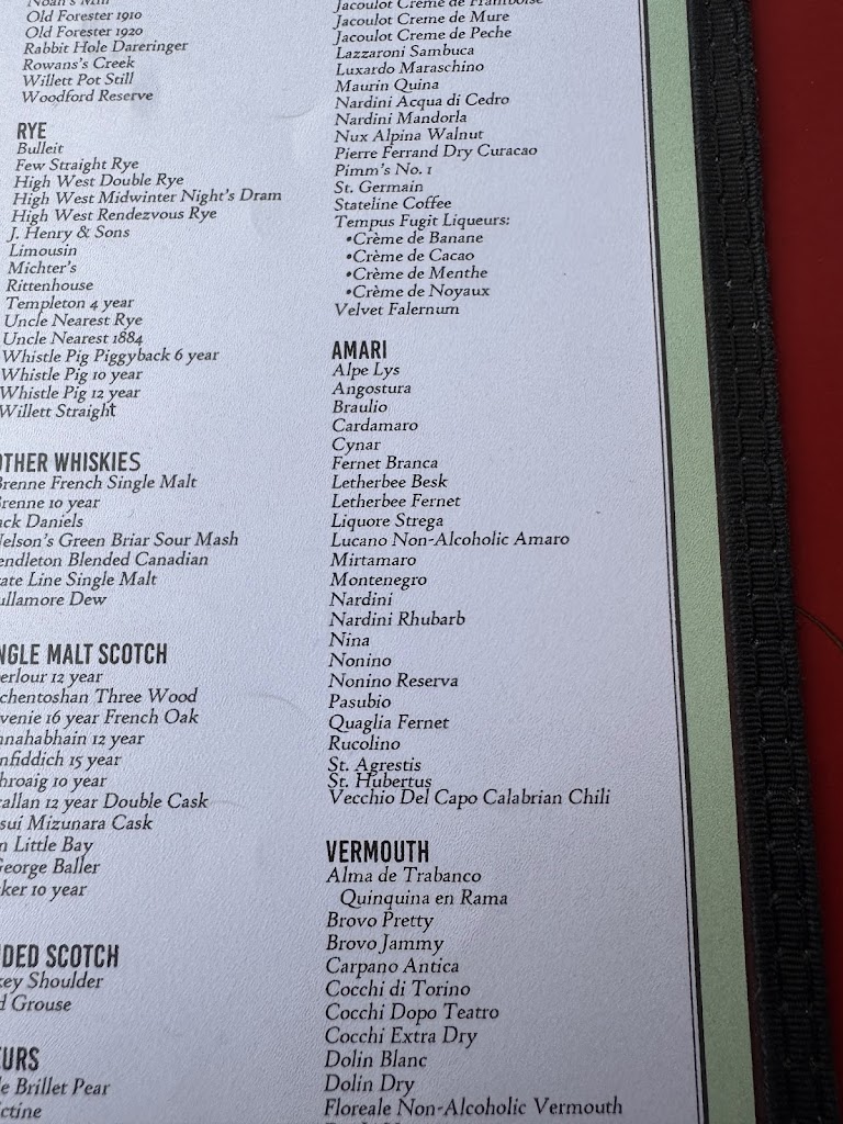 I though the food was a little expensive at first sight given the local area is a little below chicago city pricing overall ($36 for two scallops for example) but I’d say the quality justifies the price here, and a lot of things are actually very nicely priced for us city folks. Like a $13 cocktail is nothing to sniff at, especially when their alcohol selection both in cocktails, non alcoholic and wine was pretty outstanding. Creative and very diverse. Get yourself a nice $13 sardine cola with root beer and absinthe, and fancy $30 old fashioned. The non alcoholic amaro sour was also really amazing. Exactly what you hope for when ordering n/a cocktails. The quality and taste of the alcoholic version with perfect presentation.