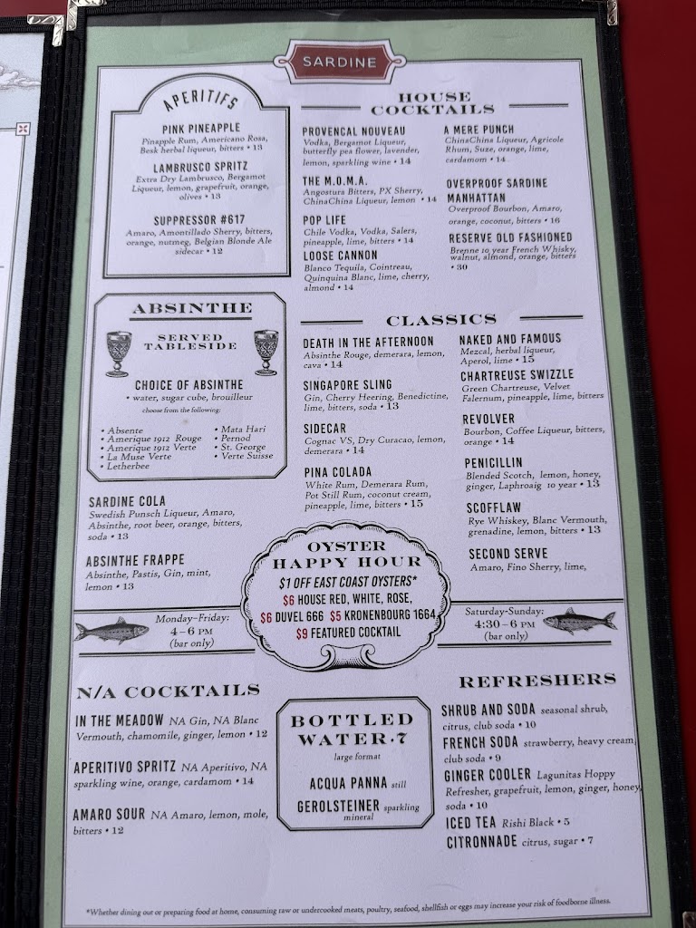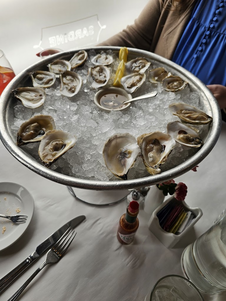 I have enjoyed many great meals and experiences at Sardine over the years. That is why I chose to meet friends there on March 14, 2025. I often don’t treat myself to a nice meal out these days and was excited! I ordered the skatewing and was very disappointed. It was mostly breading, in my opinion. I had a lovely cocktail, however. I don’t recall the name but it had lavender and butterfly pea syrup and was wonderful. We finished our meal and waited almost 45” to get our plates removed. We ordered dessert and that took another 20 minutes. Our waiter seemed rushed and distracted. For the amount of money we paid I feel it was a disappointing evening, except for the company. I have always loved the atmosphere there, but in the future I will stick to the oysters and cocktails, if I return.