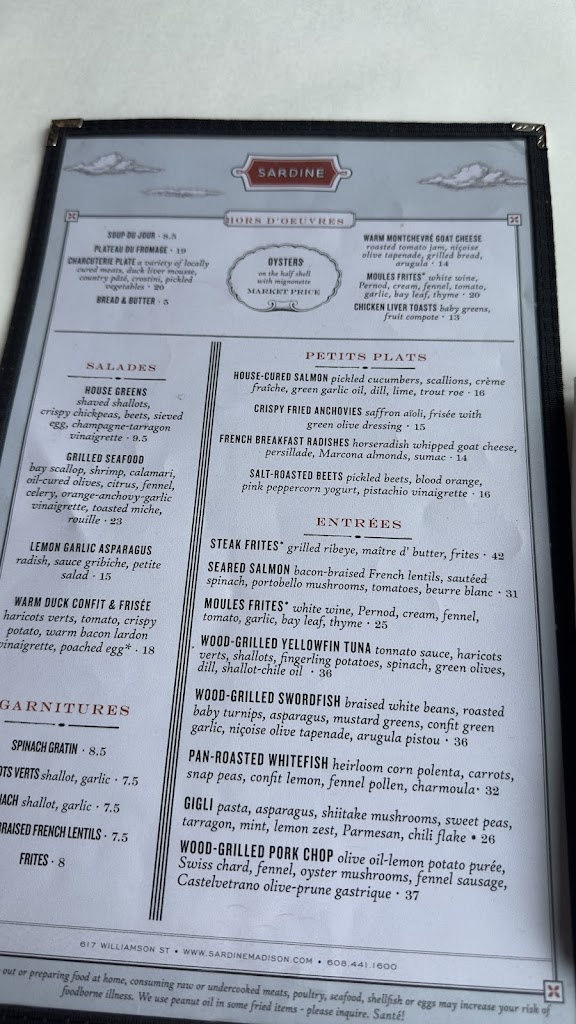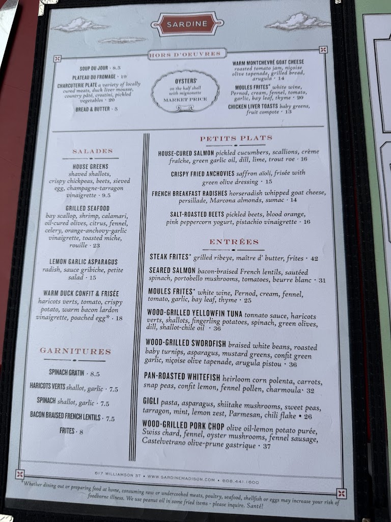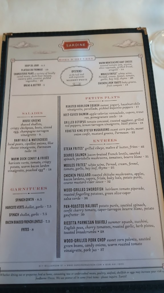 Fabulous experience at Sardine - almost everything tasted fresh and well-executed. House salad and pork chop were excellent. We also had the duck dish; I thought the mashed potatoes were a tad too salty and duck would have fared better if less cooked (perhaps a medium rare rather than medium). Extensive drinks list and attentive service too. Overall, a wonderful time and possibly the best restaurant in Madison!