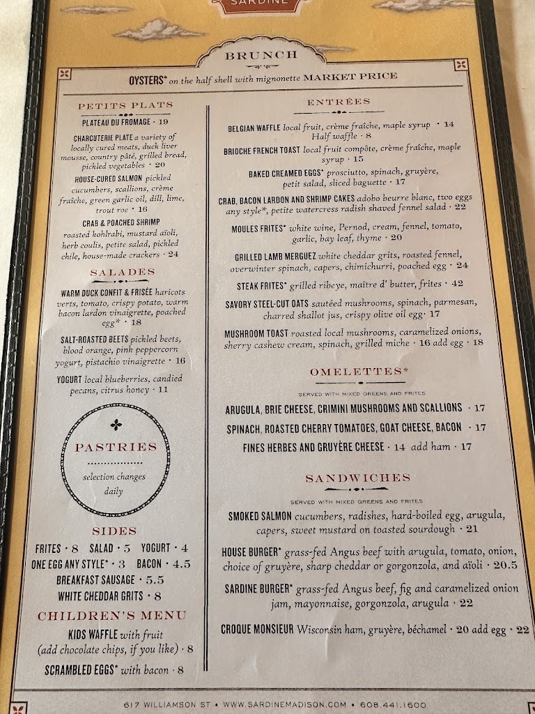 Lived in Madison for a long time but have never been to Sardine. I’m sad I waited that long. Brunch was amazing, service was wonderful; loved the atmosphere. PEI oysters were phenomenal, and ice cold. Creamed egg dish was so good, eggs were a little overcooked and I’m sure they would have remedied it for me but didn’t wanna bother and scraped the plate clean regardless. Sorbet and pot de cremé also delicious. Bellini was standard and good. American coffee was a pleasant surprise and best I’ve had anywhere in Madison. Will definitely be back for brunch and hoping to try dinner and happy hour as well.