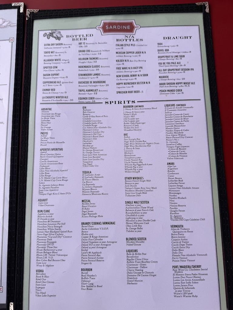 Sardine is *always* fantastic. It is our go-to spot for a special occasion or just a night out. Tonight, we dined and indulged with a bottle of Agrapart & Fils champagne, PEI oysters on the half shell, jumbo gulf shrimp, steak, fish, salad & French onion soup. We rounded off our meal with an absolutely heavenly pot de creme & blackberry tart. PHENOMENAL! And, our waiter was truly a joy. From brunch to lunch & dinner, I’ve never had anything other than a 5 star experience at Sardine. Bon appétit!