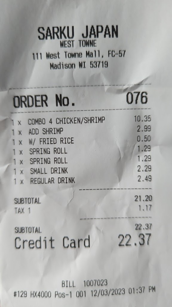 Sarku on the East side of Madison is much better. The chicken here was overdone. The egg rolls were too crispy to eat, and tasted like they had been sitting for awhile.
